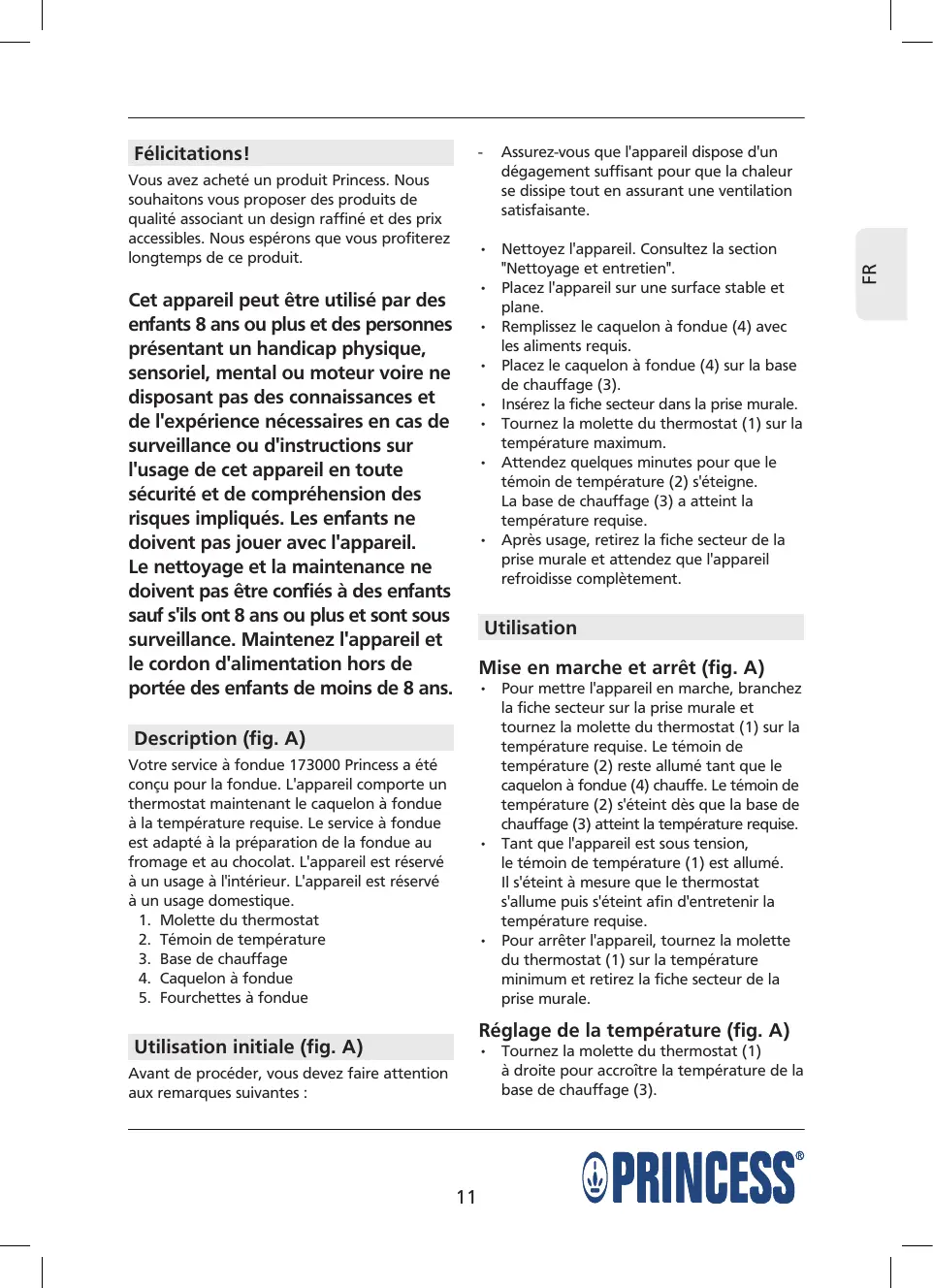 Votre service à fondue 173000 Princess a été conçu pour la fondue. L'appareil comporte un thermostat maintenant le caquelon à fondue à la température requise. Le service à fondue est adapté à la préparation de la fondue au fromage et au chocolat. L'appareil est réservé à un usage à l'intérieur. L'appareil est réservé à un usage domestique. 1. Molette du thermostat 2. Témoin de température 3. Base de chauffage 4. Caquelon à fondue 5. Fourchettes à fondue