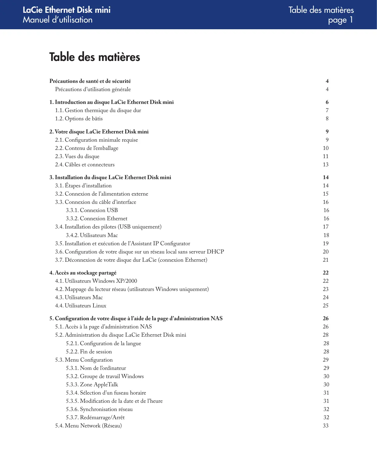 LaCie Ethernet Disk mini Manuel d’utilisation Table des matières page Table des matières Précautions de santé et de sécurité Précautions d’utilisation générale