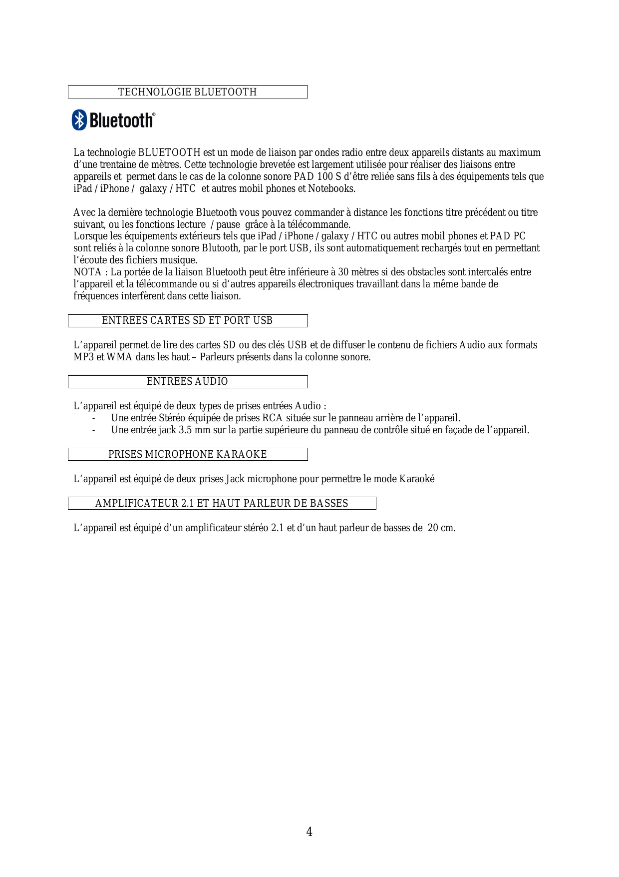 La technologie BLUETOOTH est un mode de liaison par ondes radio entre deux apparciels distants au maximum d'une trentaine de metres. Cette technologie brevetee est largement utilisée pour réaliser des liaisons entre apparciels et permet dans le cas de la colonne sonore PAD 100 S d'être reliée sans fils à des équipements tels que iPad / iPhone / galaxy / HTC et autres mobil phones et Notebooks.