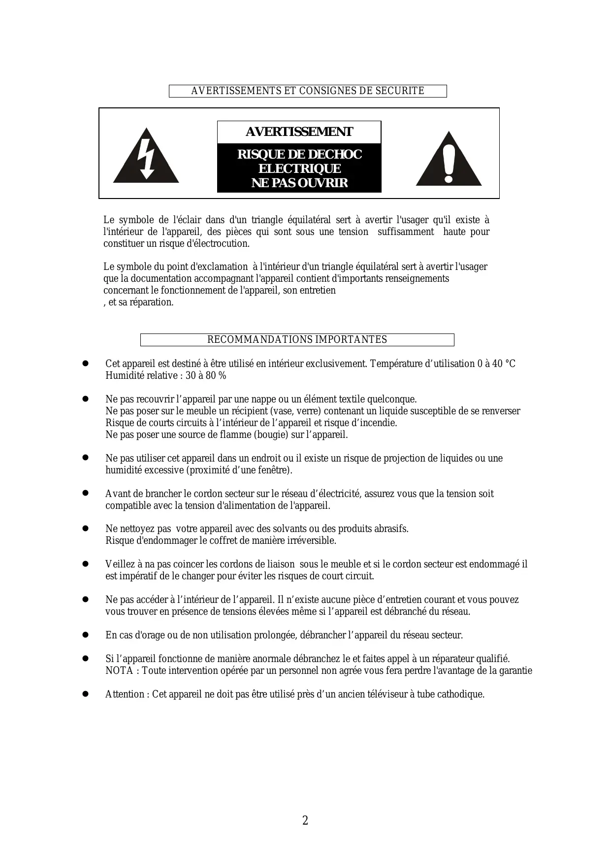 Le symbole de l'éclair dans d'un triangle équilatéral sert à avertir l'usager qu'il existe à l'intérieur de l'appareil, des pièces qui sont sous une tension suffisamment haute pour constituer un risque d'électrocution. Le symbole du point d'exclamation à l'intérieur d'un triangle équilatéral sert à avertir l'usager que la documentation accompagnant l'appareil contient d'importants renseignements concernant le fonctionnement de l'appareil, son entretien , et sa réparation. RECOMMANDATIONS IMPORTANTES