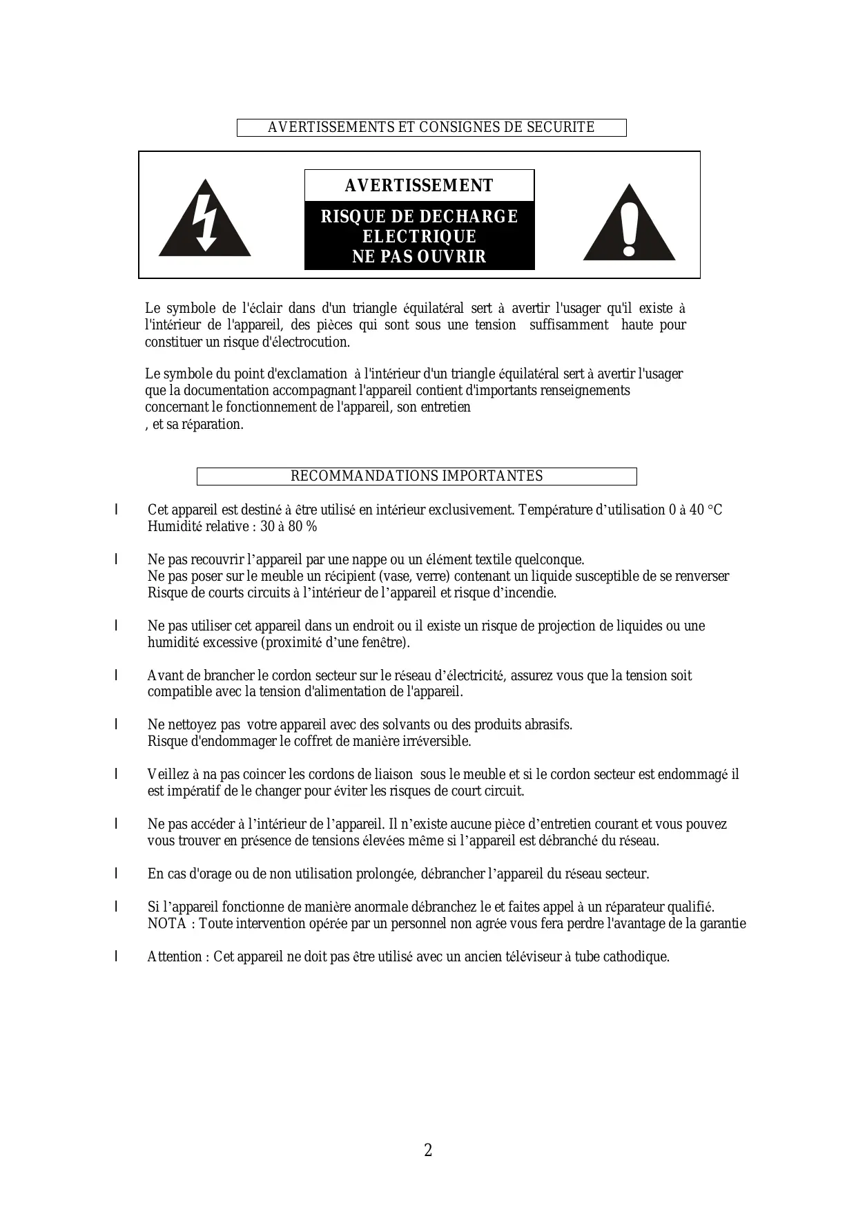 Cet appareil est destiné à être utilisé en intérieur exclusivement. Température d'utilisation 0 à 40°C. Humidité relative : 30 à 80%. Ne pas recouvrir l'appareil par une nappe ou un élément textile quelconque. Ne pas poser sur le meuble un récipient (vase, verre) contenant un liquide susceptible de se renverser. Risque de courts-circuits à l'intérieur de l'appareil et risque d'incendie. Ne pas utiliser cet appareil dans un endroit où il existe un risque de projection de liquides ou une humidité excessive (proximité d'une fenêtre). Avant de brancher le cordon secteur sur le réseau d'électricité, assurez-vous que la tension soit compatible avec la tension d'alimentation de l'appareil. Ne nettoyez pas votre appareil avec des solvants ou des produits abrasifs. Risque d'endommager le coffret de manière irréversible. Veillez à ne pas coincer les cordons de liaison sous le meuble et si le cordon secteur est endommagé, il est impératif de le changer pour éviter les risques de court-circuit. Ne pas accéder à l'intérieur de l'appareil. Il n'existe aucune pièce d'entretien courante et vous pouvez vous trouver en présence de tensions élevées même si l'appareil est débranché du réseau. En cas d'orage ou de non-utilisation prolongée, débranchez l'appareil du réseau secteur. Si l'appareil fonctionne de manière anormale, débranchez-le et faites appel à un réparateur qualifié. NOTEA : Toute intervention opérée par un personnel non agréé vous fera perdre l'avantage de la garantie. Attention : Cet appareil ne doit pas être utilisé avec un ancien téléviseur à tube cathodique.