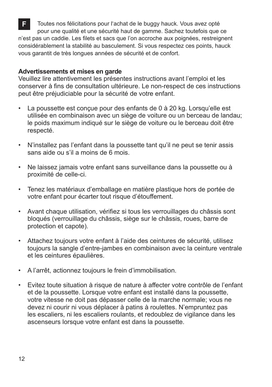 F Toutes nos félicitations pour l‘achat de le buggy hauck. Vous avez opté pour une qualité et une sécurité haut de gamme. Sachez toutefois que ce n’est pas un caddie. Les filets et sacs que l’on accroche aux poignées, restreignent considérablement la stabilité au basculement. Si vous respectez ces points, hauck vous garantit de très longues années de sécurité et de confort.