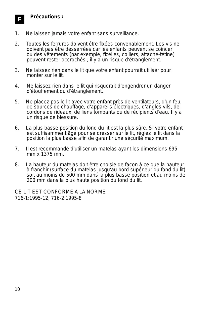 La plus basse position du fond du lit est la plus sûre. Si votre enfant est suffisamment âgé pour se dresser sur le lit, réglez le lit dans la position la plus basse afin de garantir une sécurité maximum.
