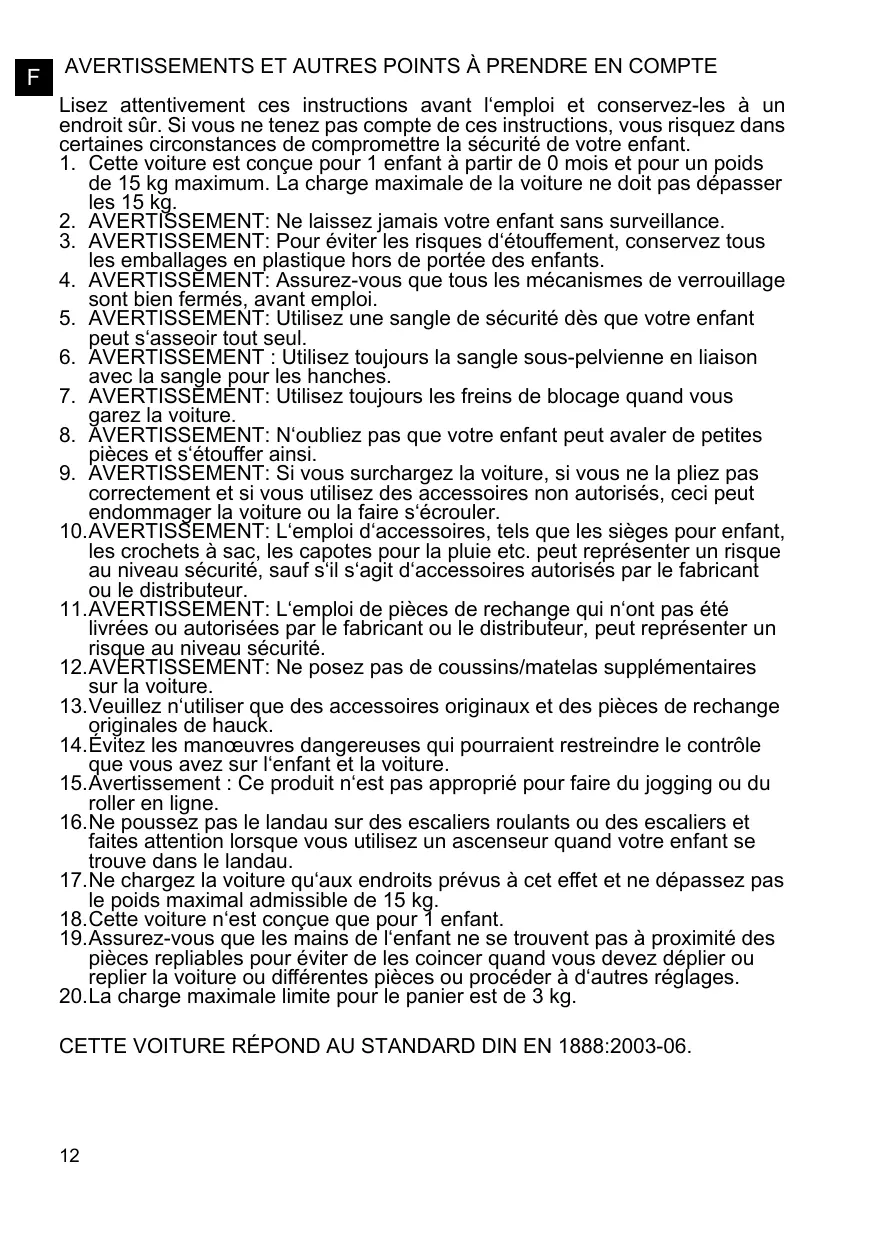AVERTISSEMENTS ET AUTRES POINTS À PRENDRE EN COMPTE Lisez attentivement ces instructions avant l‘emploi et conservez-les à un endroit sûr. Si vous ne tenez pas compte de ces instructions, vous risquez dans certaines circonstances de compromettre la sécurité de votre enfant. 1. Cette voiture est conçue pour 1 enfant à partir de 0 mois et pour un poids de 15 kg maximum. La charge maximale de la voiture ne doit pas dépasser les 15 kg. 2. AVERTISSEMENT: Ne laissez jamais votre enfant sans surveillance. 3. AVERTISSEMENT: Pour éviter les risques d‘étouffement, conservez tous les emballages en plastique hors de portée des enfants. 4. AVERTISSEMENT: Assurez-vous que tous les mécanismes de verrouillage sont bien fermés, avant emploi. 5. AVERTISSEMENT: Utilisez une sangle de sécurité dès que votre enfant peut s‘asseoir tout seul. 6. AVERTISSEMENT : Utilisez toujours la sangle sous-pelvienne en liaison avec la sangle pour les hanches. 7. AVERTISSEMENT: Utilisez toujours les freins de blocage quand vous garez la voiture. 8. AVERTISSEMENT: N‘oubliez pas que votre enfant peut avaler de petites pièces et s‘étouffer ainsi. 9. AVERTISSEMENT: Si vous surchargez la voiture, si vous ne la pliez pas correctement et si vous utilisez des accessoires non autorisés, ceci peut endommager la voiture ou la faire s‘écrouler. 10.AVERTISSEMENT: L‘emploi d‘accessoires, tels que les sièges pour enfant, les crochets à sac, les capotes pour la pluie etc. peut représenter un risque au niveau sécurité, sauf s‘il s‘agit d‘accessoires autorisés par le fabricant ou le distributeur. 11.AVERTISSEMENT: L‘emploi de pièces de rechange qui n‘ont pas été livrées ou autorisées par le fabricant ou le distributeur, peut représenter un risque au niveau sécurité. 12.AVERTISSEMENT: Ne posez pas de coussins/matelas supplémentaires sur la voiture. 13.Veuillez n‘utiliser que des accessoires originaux et des pièces de rechange originales de hauck. 14.Évitez les manœuvres dangereuses qui pourraient restreindre le contrôle que vous avez sur l‘enfant et la voiture. 15.Avertissement : Ce produit n‘est pas approprié pour faire du jogging ou du roller en ligne. 16.Ne poussez pas le landau sur des escaliers roulants ou des escaliers et faites attention lorsque vous utilisez un ascenseur quand votre enfant se trouve dans le landau. 17.Ne chargez la voiture qu‘aux endroits prévus à cet effet et ne dépassez pas le poids maximal admissible de 15 kg. 18.Cette voiture n‘est conçue que pour 1 enfant. 19.Assurez-vous que les mains de l‘enfant ne se trouvent pas à proximité des pièces repliables pour éviter de les coincer quand vous devez déplier ou replier la voiture ou différentes pièces ou procéder à d‘autres réglages. 20.La charge maximale limite pour le panier est de 3 kg. CETTE VOITURE RÉPOND AU STANDARD DIN EN 1888:2003-06.