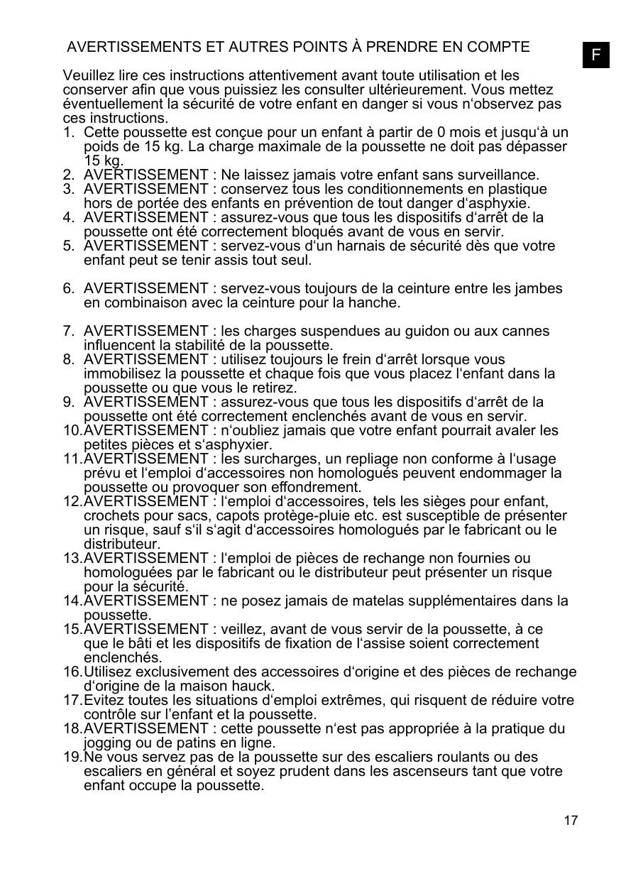 AVERTISSEMENTS ET AUTRES POINTS À PRENDRE EN COMPTE Veuillez lire ces instructions attentivement avant toute utilisation et les conserver afin que vous puissiez les consulter ultérieurement. Vous mettez éventuellement la sécurité de votre enfant en danger si vous n‘observez pas ces instructions. 1. Cette poussette est conçue pour un enfant à partir de 0 mois et jusqu‘à un poids de 15 kg. La charge maximale de la poussette ne doit pas dépasser 15 kg. 2. AVERTISSEMENT : Ne laissez jamais votre enfant sans surveillance. 3. AVERTISSEMENT : conservez tous les conditionnements en plastique hors de portée des enfants en prévention de tout danger d‘asphyxie. 4. AVERTISSEMENT : assurez-vous que tous les dispositifs d‘arrêt de la poussette ont été correctement bloqués avant de vous en servir. 5. AVERTISSEMENT : servez-vous d‘un harnais de sécurité dès que votre enfant peut se tenir assis tout seul. 6. AVERTISSEMENT : servez-vous toujours de la ceinture entre les jambes en combinaison avec la ceinture pour la hanche. 7. AVERTISSEMENT : les charges suspendues au guidon ou aux cannes influencent la stabilité de la poussette. 8. AVERTISSEMENT : utilisez toujours le frein d‘arrêt lorsque vous immobilisez la poussette et chaque fois que vous placez l‘enfant dans la poussette ou que vous le retirez. 9. AVERTISSEMENT : assurez-vous que tous les dispositifs d‘arrêt de la poussette ont été correctement enclenchés avant de vous en servir. 10.AVERTISSEMENT : n‘oubliez jamais que votre enfant pourrait avaler les petites pièces et s‘asphyxier. 11.AVERTISSEMENT : les surcharges, un repliage non conforme à l‘usage prévu et l‘emploi d‘accessoires non homologués peuvent endommager la poussette ou provoquer son effondrement. 12.AVERTISSEMENT : l‘emploi d‘accessoires, tels les sièges pour enfant, crochets pour sacs, capots protège-pluie etc. est susceptible de présenter un risque, sauf s‘il s‘agit d‘accessoires homologués par le fabricant ou le distributeur. 13.AVERTISSEMENT : l‘emploi de pièces de rechange non fournies ou homologuées par le fabricant ou le distributeur peut présenter un risque pour la sécurité. 14.AVERTISSEMENT : ne posez jamais de matelas supplémentaires dans la poussette. 15.AVERTISSEMENT : veillez, avant de vous servir de la poussette, à ce que le bâti et les dispositifs de fixation de l‘assise soient correctement enclenchés. 16.Utilisez exclusivement des accessoires d‘origine et des pièces de rechange d‘origine de la maison hauck. 17.Evitez toutes les situations d‘emploi extrêmes, qui risquent de réduire votre contrôle sur l’enfant et la poussette. 18.AVERTISSEMENT : cette poussette n‘est pas appropriée à la pratique du jogging ou de patins en ligne. 19.Ne vous servez pas de la poussette sur des escaliers roulants ou des escaliers en général et soyez prudent dans les ascenseurs tant que votre enfant occupe la poussette. 17