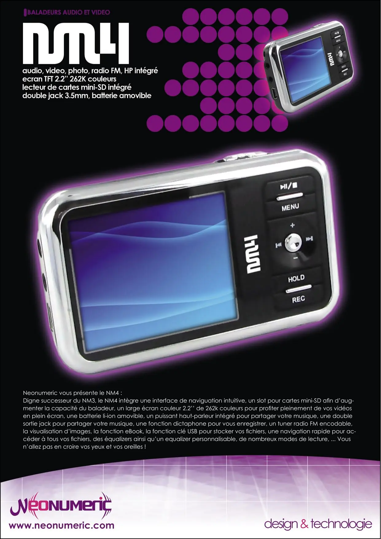 Digne successeur du NM3, le NM4 intègre une interface de navigation intuitive, un slot pour cartes mini-SD afin d'augmenter la capacité du baladeur, un large écran couleur 2.2" de 262k couleurs pour profiter pleinement de vos vidés en plein écran, une batterie li-ion amovible, un puissant haut-parleur intégré pour partager votre musique, une double sortie jack pour partager votre musique, une fonction dictaphone pour vous enregistrer, un tuner radio FM encodable, la visualisation d'images, la fonction eBook, la fonction clé USB pour stocker vos fichiers, une navigation rapide pour acceder à tous vos fichiers, des équalizers ainsi qu'un equalizer personnalisable, de nombreux modes de lecture, ... Vous n'allez pas en croire vos yeux et vos oreilles !
