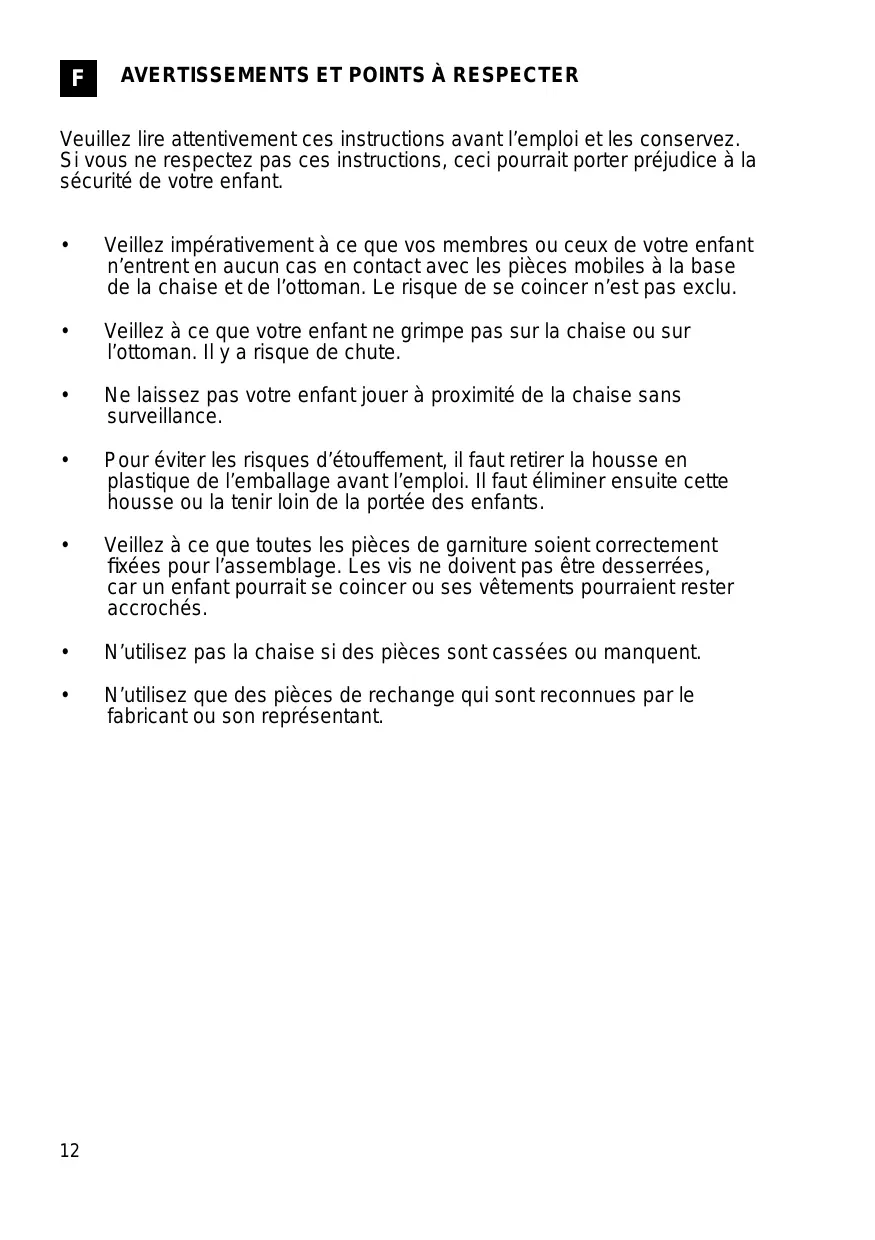 Veillez impérativement à ce que vos membres ou ceux de votre enfant n’entrent en aucun cas en contact avec les pièces mobiles à la base de la chaise et de l’ottoman. Le risque de se coincer n’est pas exclu.