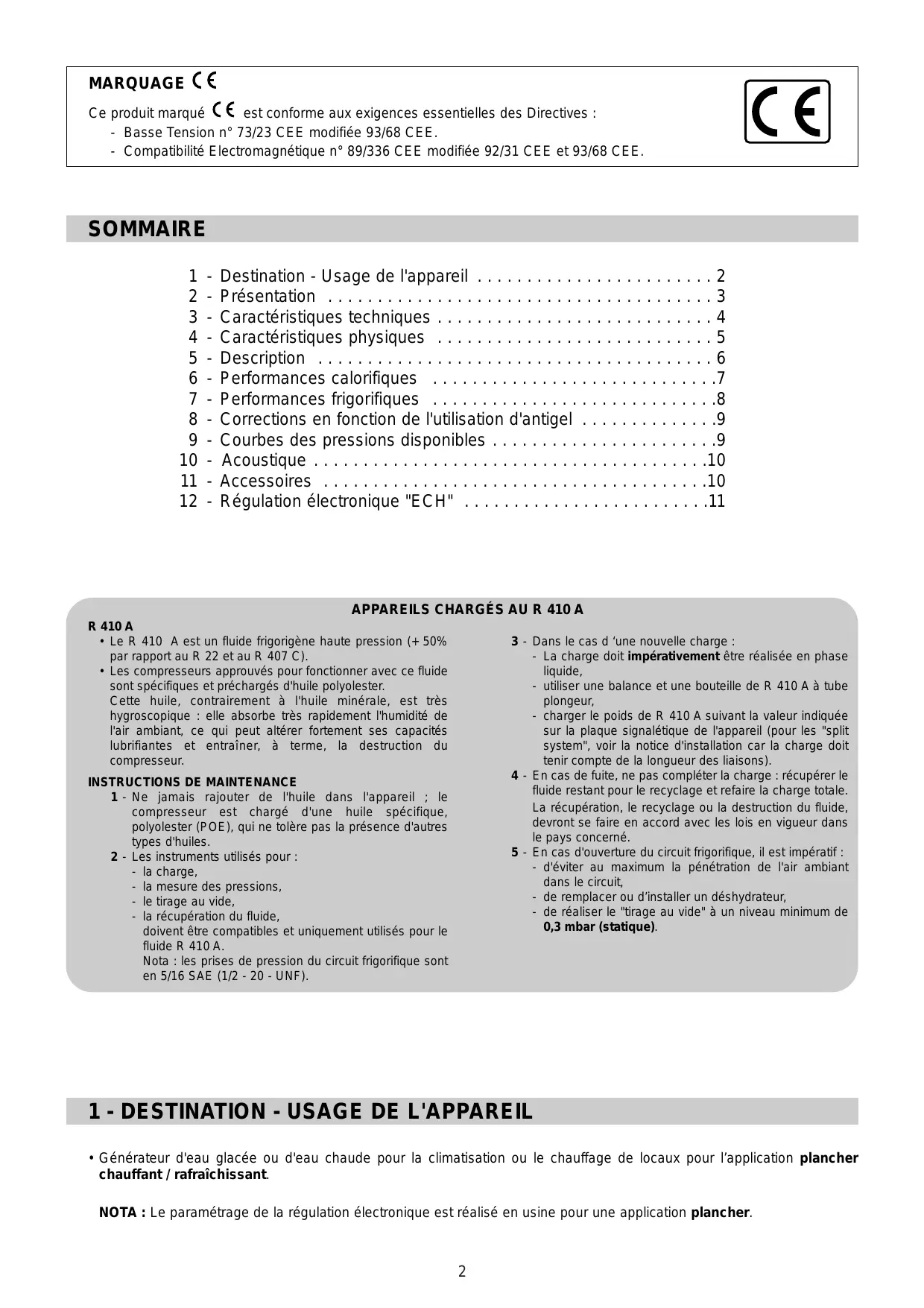 + Générateur d'eau glacée ou d'eau chaude pour la climatisation ou le chauffage de locaux pour l'application plancher chauffant / rafraîchissant. NOTA : Le paramétrage de la régulation électronique est réalisé en usine pour une application plancher.