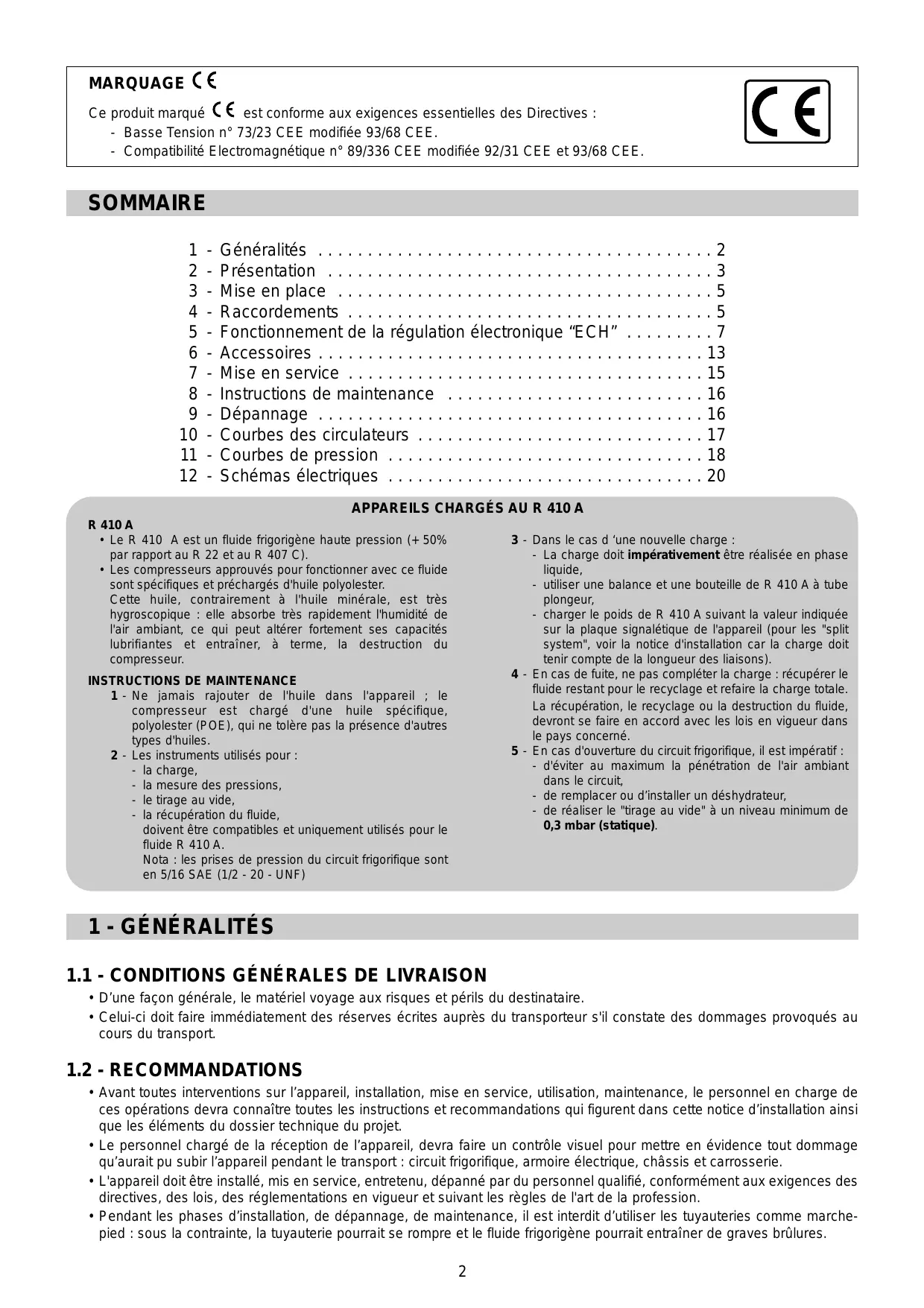 1 - Généralités 2 2 - Présentation 3 3 - Mise en place 5 4 - Raccordements 5 5 - Fonctionnement de la régulation électronique "ECH" 7 6 - Accessoires 13 7 - Mise en service 15 8 - Instructions de maintenance 16 9 - Dépannage 16 10 - Courbes des circulateurs 17 11 - Courbes de pression 18 12 - Schémas électriques 20