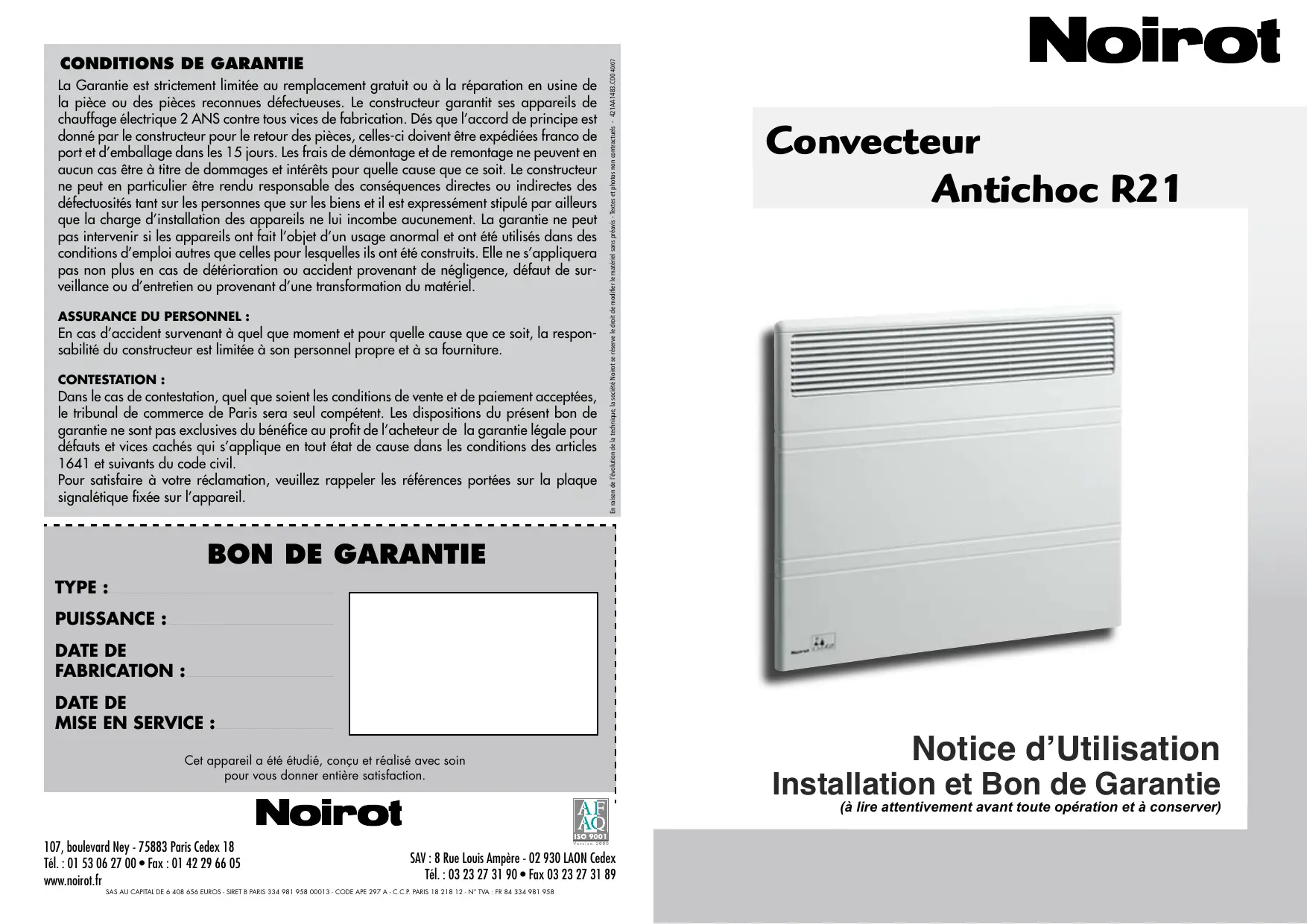 Cet appareil a été étudié, conçu et réalisé avec soin pour vous donner entière satisfaction. Notice d’Utilisation Installation et Bon de Garantie (à lire attentivement avant toute opération et à conserver) 107, boulevard Ney - 75883 Paris Cedex 18 Tél. : 01 53 06 27 00 • Fax : 01 42 29 66 05 www.noirot.fr SAV : 8 Rue Louis Ampère - 02 930 LAON Cedex Tél. : 03 23 27 31 90 • Fax 03 23 27 31 89 SAS au Capital de 6 408 656 EUROS - SIRET B PARIS 334 981 958 00013 - Code APE 297 A - C.C.P. PARIS 18 218 12 - N° TVA : FR 84 334 981 958