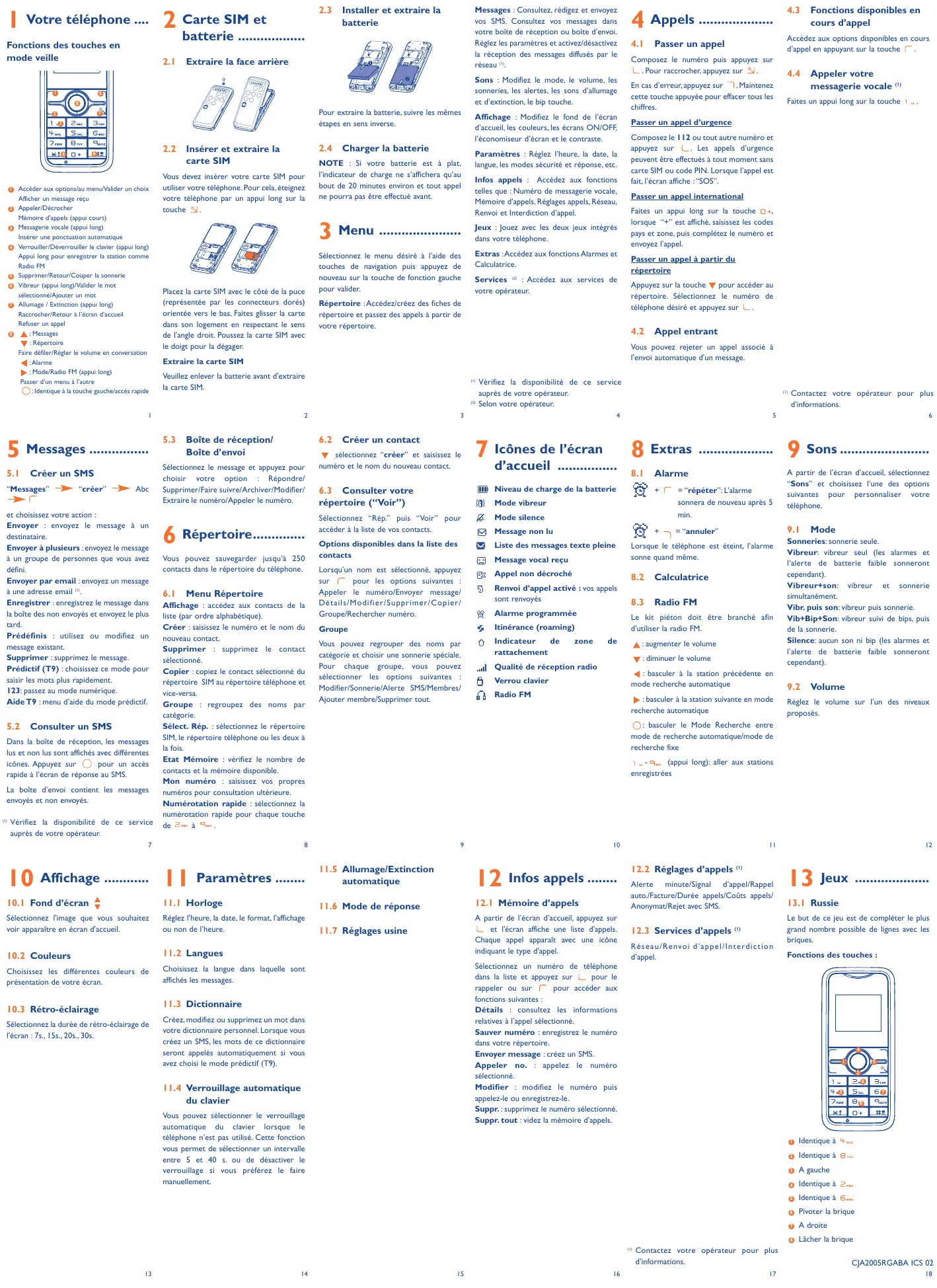 - ONDES ELECTROMAGNETIQUES : La preuve de la conformité aux exigences internationales (ICNIRP) ou à la directive européenne 1999/5/CE (R&TTE) est une condition préalable à la mise sur le marché de tout modèle de téléphone portable. La protection de la santé et de la sécurité de l’utilisateur, ainsi que de toute autre personne, constitue un aspect essentiel de ces exigences internationales et de la directive européenne. TELEPHONE MOBILE EST CONFORME AUX EXIGENCES