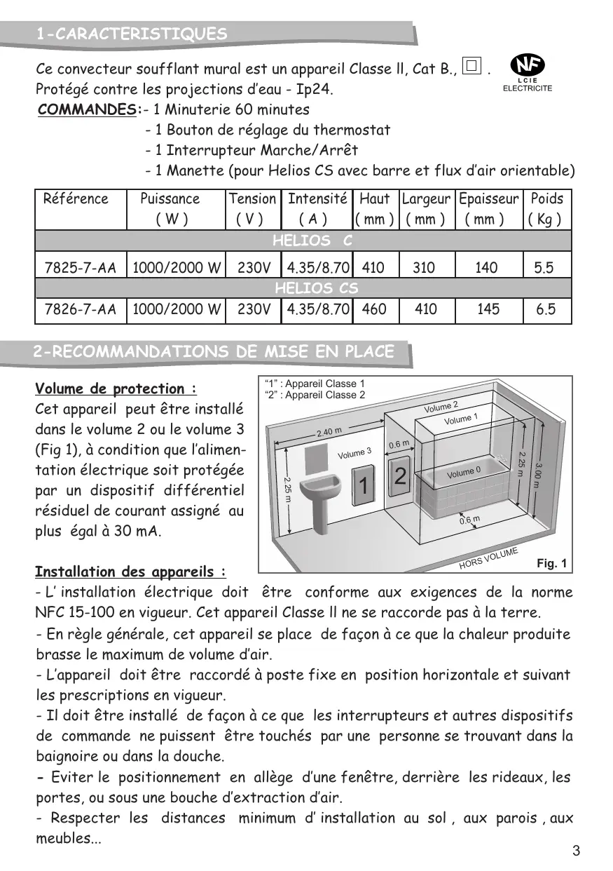 Fig. 1 Installation des appareils : - L’ installation électrique doit être conforme aux exigences de la norme NFC 15-100 en vigueur. Cet appareil Classe ll ne se raccorde pas à la terre. - En règle générale, cet appareil se place de façon à ce que la chaleur produite brasse le maximum de volume d’air. - L’appareil doit être raccordé à poste fixe en position horizontale et suivant les prescriptions en vigueur. - Il doit être installé de façon à ce que les interrupteurs et autres dispositifs de commande ne puissent être touchés par une personne se trouvant dans la baignoire ou dans la douche. - Eviter le positionnement en allège d’une fenêtre, derrière les rideaux, les portes, ou sous une bouche d’extraction d’air. - Respecter les distances minimum d’ installation au sol , aux parois , aux meubles...