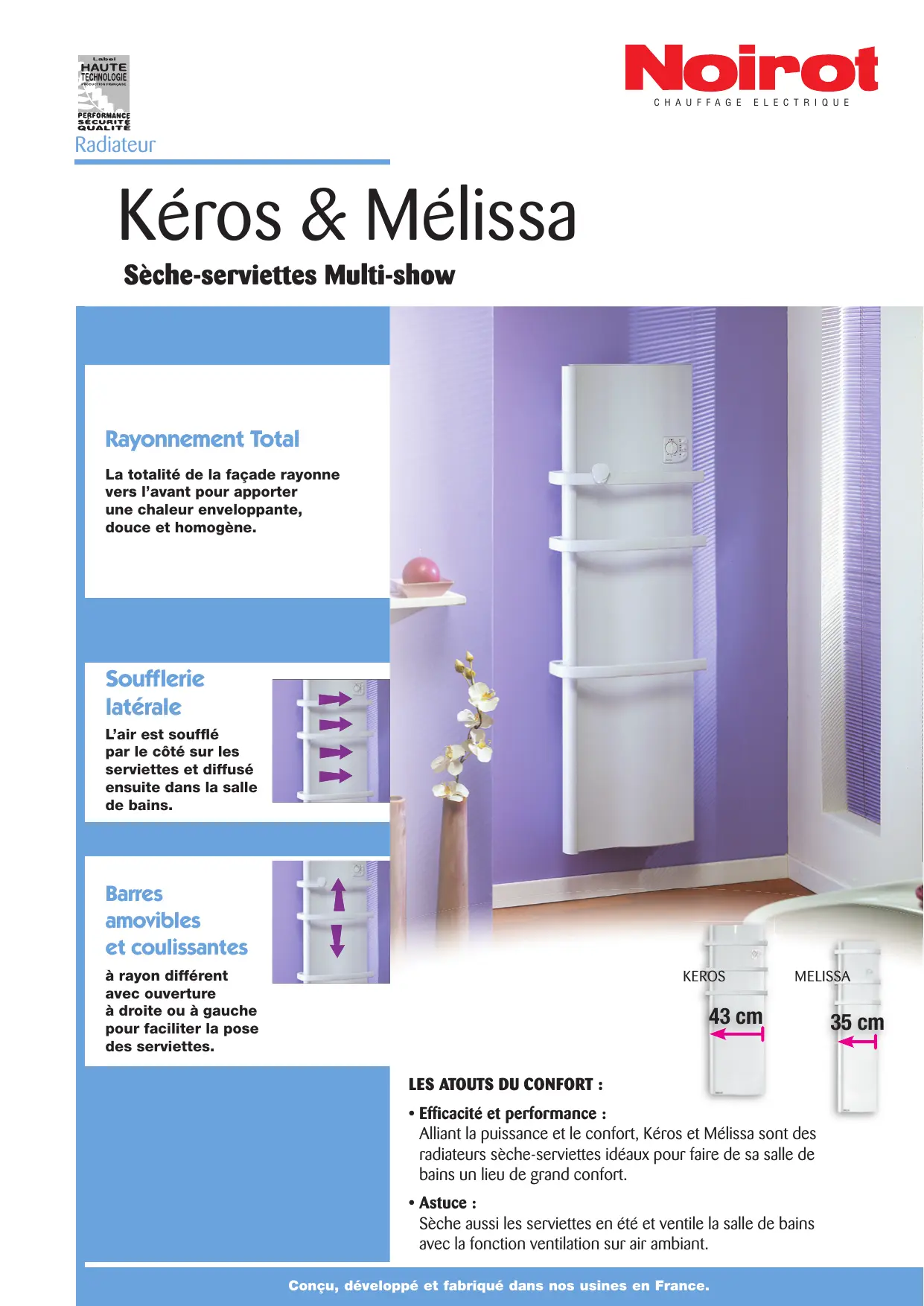 - Astuce : Sèche aussi les serviettes en été et ventile la salle de bains avec la fonction ventilation sur air ambiant. Conçu, développé et fabriqué dans nos usines en France. 35 cm Radiateur Sèche-serviettes Kéros & Mélissa