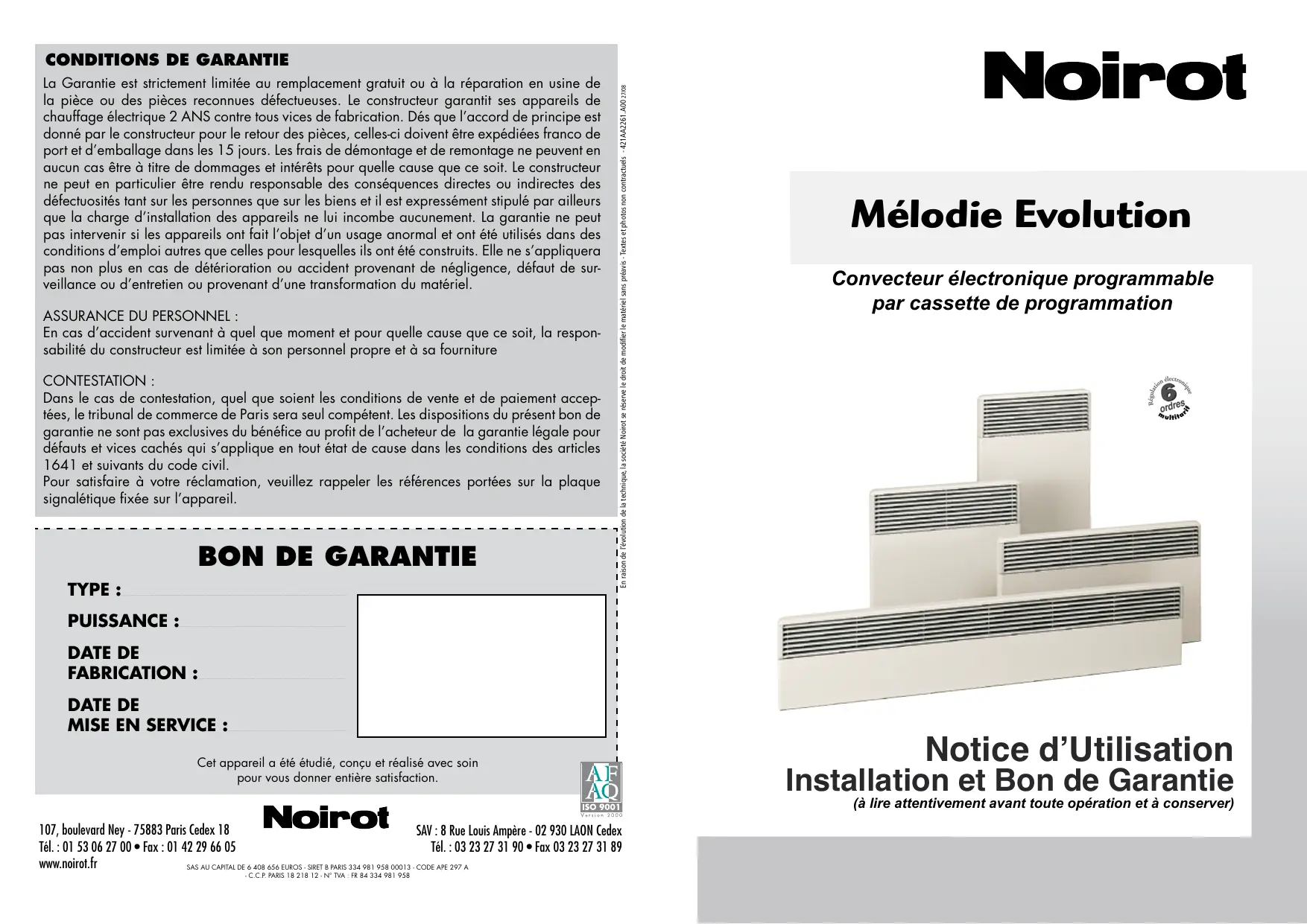 TYPE : PUISSANCE : DATE DE FABRICATION : DATE DE MISE EN SERVICE : Cet appareil a été étudié, conçu et réalisé avec soin pour vous donner entière satisfaction. ion del technique la soc Nokot se réserve le croi de mode le matériel sans préavis Tete etphotos non contact 107, boulevard Ney - 75883 Paris Cedex 18 Noirot SAV : 8 Rue Louis Ampère - 02 930 LAON Cedex Tél. : 01 53 06 27 00 e Fax : 01 42 29 66 05 Tél. : 03 23 27 31 90 e Fox 03 23 27 31 89 w.noirot.fr SAS AU CARTAL DE 6 408 656 EUROS SRET 8 PAR 324 1 858 00012 «CODE APE 297 À ER PS 1821812 A 1 Be 22e Pl 938 Noirot Mélodie Evolution Convecteur électronique programmable par cassette de programmation Notice d'Utilisation Installation et Bon de Garantie (à lire attentivement avant toute opération et à conserver)