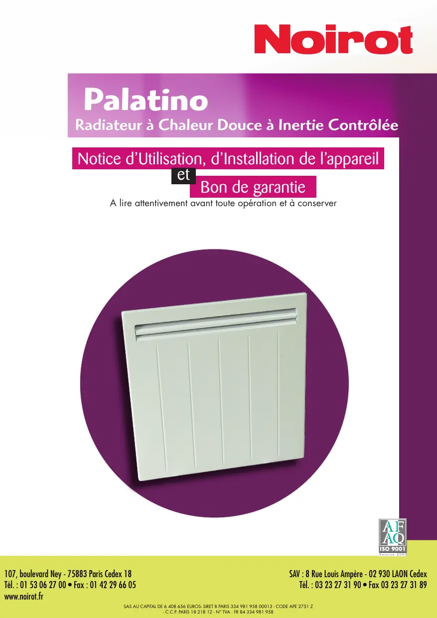 Palatino Radiateur à Chaleur Douce à Inertie Contrôlée Notice d’Utilisation, d’Installation de l’appareil Bon de garantie A lire attentivement avant toute opération et à conserver 107, boulevard Ney - 75883 Paris Cedex 18 Tél. : 01 53 06 27 00 • Fax : 01 42 29 66 05 www.noirot.fr SAV : 8 Rue Louis Ampère - 02 930 LAON Cedex Tél. : 03 23 27 31 90 • Fax 03 23 27 31 89 SAS au Capital de 6 408 656 euros- SIRET B PARIS 334 981 958 00013 - Code APE 2751 Z - C.C.P. PARIS 18 218 12 - N° TVA : FR 84 334 981 958 AVANT PROPOS : - Vous venez d’acquérir ce Radiateur Chaleur Douce à Inertie Contrôlée Palatino de Noirot et nous vous remercions de ce choix, témoignant ainsi de votre confiance. - Cet appareil a été étudié, conçu et réalisé avec soin pour vous donner entière satisfaction. - Il est important de bien lire cette notice en entier avant l’installation et la mise en route de votre appareil. - Il est recommandé de conserver cette notice, même après installation de votre appareil. SOMMAIRE