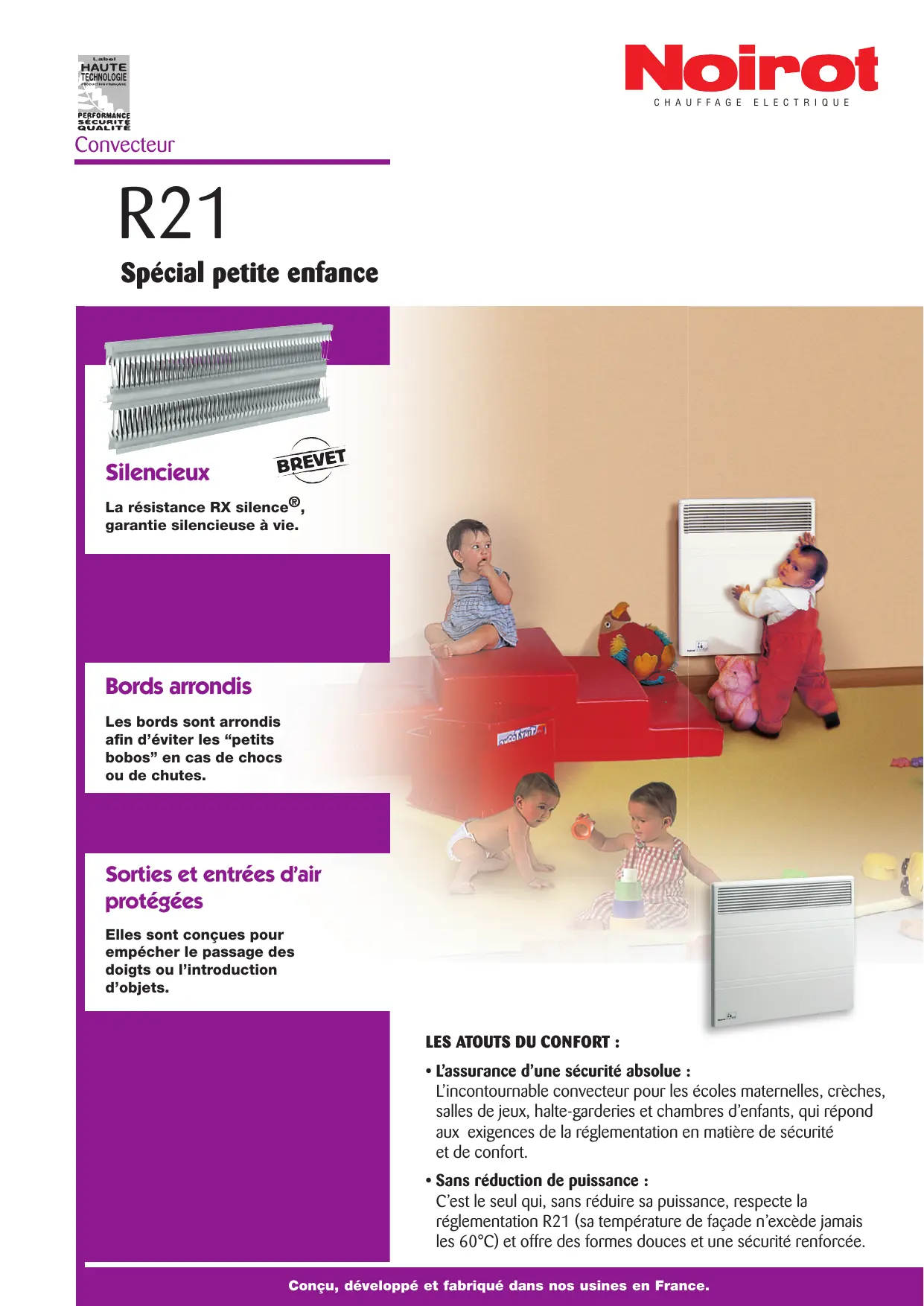 - Sans réduction de puissance : C’est le seul qui, sans réduire sa puissance, respecte la réglementation R21 (sa température de façade n’excède jamais les 60°C) et offre des formes douces et une sécurité renforcée. Conçu, développé et fabriqué dans nos usines en France. Convecteur Spécial petite enfance R21