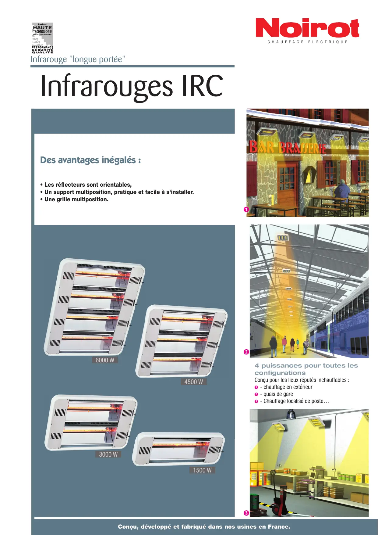 Conçu, développé et fabriqué dans nos usines en France. Infrarouges " longue portée" Infrarouges IRC LES RÉFLECTEURS ORIENTABLES : un système exclusif et breveté PRATIQUE, FACILE À INSTALLER, un support multiposition LES RÉFLECTEURS ORIENTABLES : un système exclusif et breveté Une manette graduée (modèle breveté) oriente les réflecteurs. Il est ainsi possible d’orienter les faisceaux et de moduler la zone de chauffe. Grâce à son support spécial multiposition qui se pose au mur comme au plafond, l’appareil peut être orienté dans tous les sens, horizontalement comme verticalement. Réflecteur parabolique diffusant : Il rayonne sur une surface plus large pour un chauffage plus doux. Grâce à ses réflecteurs individuellement orientables, la surface de chauffe d’un même appareil peut être modulée à volonté. BREVET