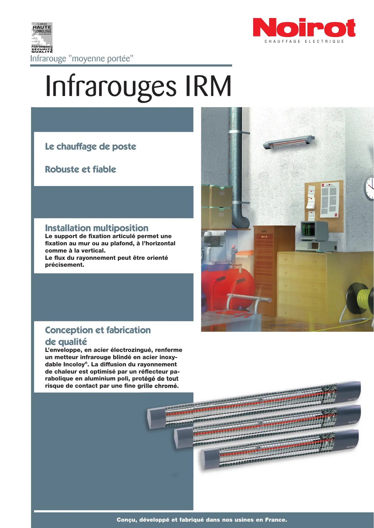 C H A U F F A G E Infrarouge "moyenne portée" Infrarouges IRM Le chauffage de poste Robuste et fiable Installation multiposition Le support de fixation articulé permet une fixation au mur ou au plafond, à l’horizontal comme à la vertical. Le flux du rayonnement peut être orienté précisement. Conception et fabrication de qualité L’enveloppe, en acier électrozingué, renferme un metteur infrarouge blindé en acier inoxydable Incoloy®. La diffusion du rayonnement de chaleur est optimisé par un réflecteur parabolique en aluminium poli, protégé de tout risque de contact par une fine grille chromé. Conçu, développé et fabriqué dans nos usines en France. E L E C T R I Q U E Infrarouges " moyenne portée" Infrarouges IRM FIXATION MULTIPOSITION