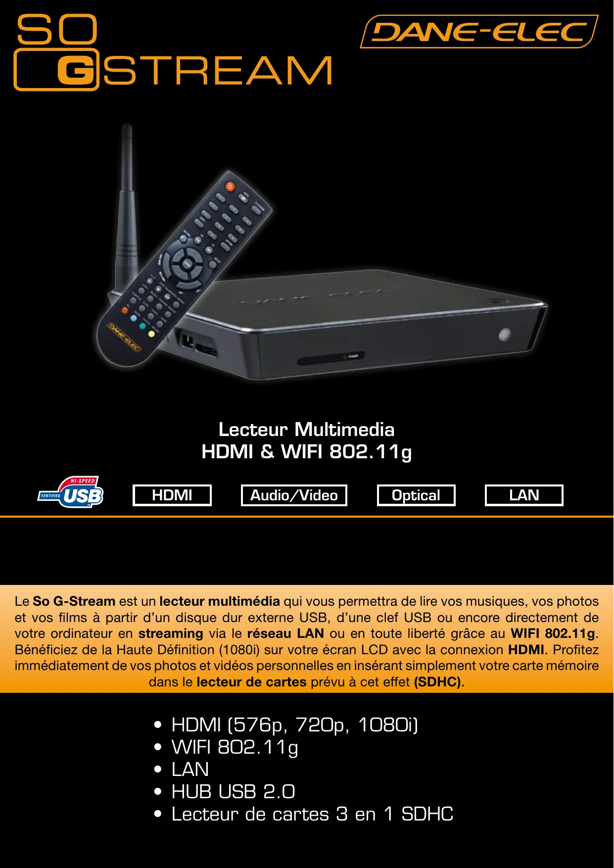 SO [DANE-ELEC) [ GS TREAM Lecteur Multimedia HDMI & WIFI 802.11g HDMI Audio/Video Optical LAN Le So G-Stream est un lecteur multimédia qui vous permettra de lire vos musiques, vos photos et vos films à partir d’un disque dur externe USB, d'une clef USB ou encore directement de votre ordinateur en streaming via le réseau LAN ou en toute liberté grâce au WIFI 802.11g. Bénéficiez de la Haute Définition (1080i) sur votre écran LCD avec la connexion HDMI. Profitez immédiatement de vos photos et vidéos personnelles en insérant simplement votre carte mémoire dans le lecteur de cartes prévu à cet effet (SDHC). ° HDMI (576p, 720p, 1080) e \WIFI 802.11g e LAN °e HUB USB 2.0 e Lecteur de cartes 3 en 1 SDHC