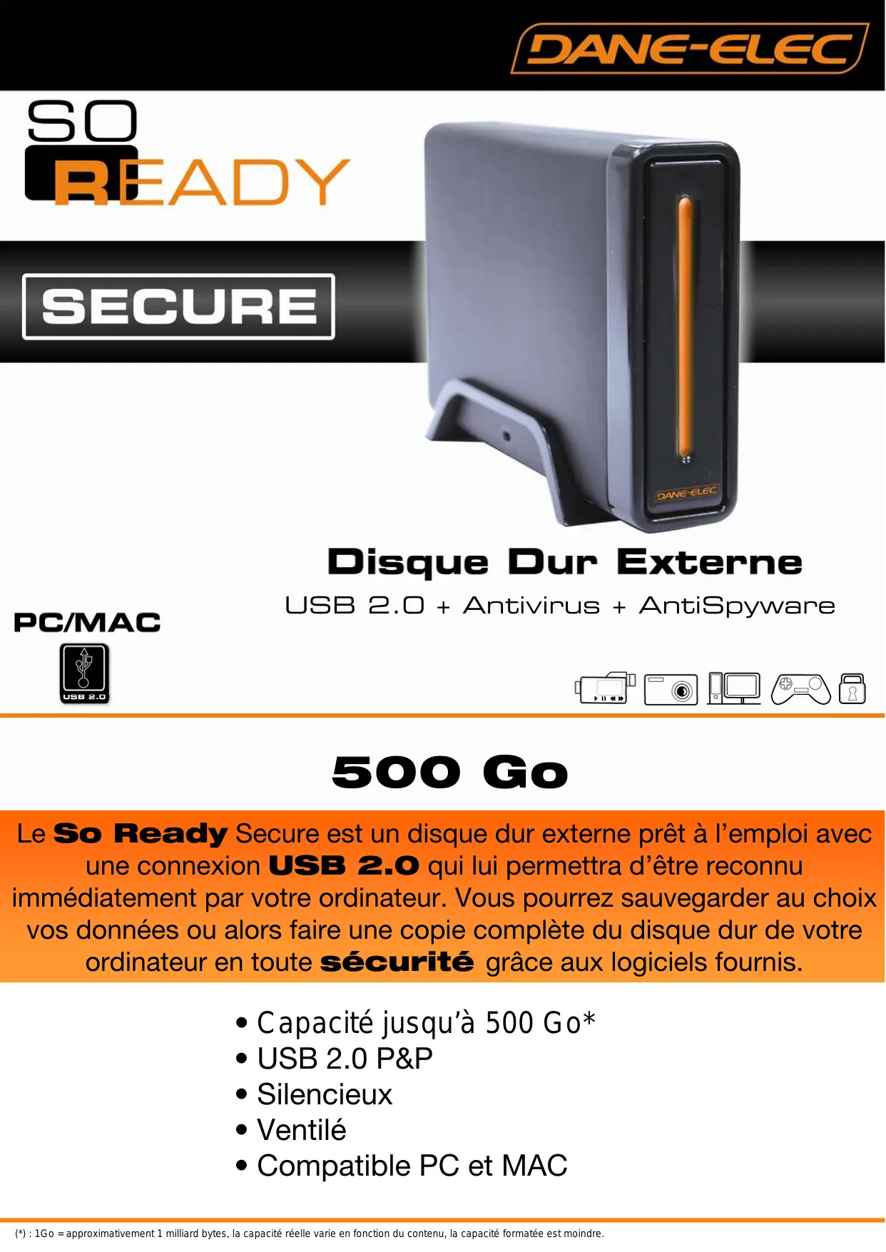 | 2, Disque Dur Externe PC/MAC USB 2.0 + Antivirus + AntiSpyware 500 Go Le So Ready Secure est un disque dur externe prêt à l'emploi avec une connexion USB 2.0 qui lui permettra d’être reconnu immédiatement par votre ordinateur. Vous pourrez sauvegarder au choix vos données ou alors faire une copie complète du disque dur de votre ordinateur en toute sécurité grâce aux logiciels fournis. e Capacité jusqu'à 500 Go* e USB 2.0 P&P e Silencieux e Ventilé e Compatible PC et MAC €): 1Go = approximativement 1 miliard bytes, la capacité réelle varie en fonction du contenu, la capacité formatée est moindre