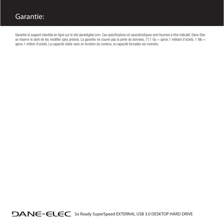 So Ready SuperSpeed EXTERNAL USB 3.0 DESKTOP HARD DRIVE Guide de démarrage Garantie: Garantie et support clientèle en ligne sur le site danedigital.com. Ces spécifications et caractéristiques sont fournies à titre indicatif, Dane-Elec se réserve le dorit de les modifier sans préavis. La garantie ne couvre pas la perte de données. (*):1 Go = aprox.1 milliard d’octets. 1 Mo = aprox.1 million d’octets. La capacité réelle varie en fonction du contenu, la capacité formatée est moindre. So Ready SuperSpeed EXTERNAL USB 3.0 DESKTOP HARD DRIVE Caractéristiques techniques: Connexion USB 3.0 (rétrocompatible à USB 2.0) Disque dur* 1 SATA Format NTFS ou FAT32 Compatible PC Microsoft® Windows® XP/Vista/Windows 7 Configuration Exigences Microsoft® Internet Explorer 5.0 ou plus récent (ou autre) avec connexion Internet pour mises à jour logicielles Dimensions 182 mm(long.) x 121 mm(larg.) x 39 mm(haut.) Poids 1.80779 lbs | 820g Garantie Garantie limitée de 2 ans