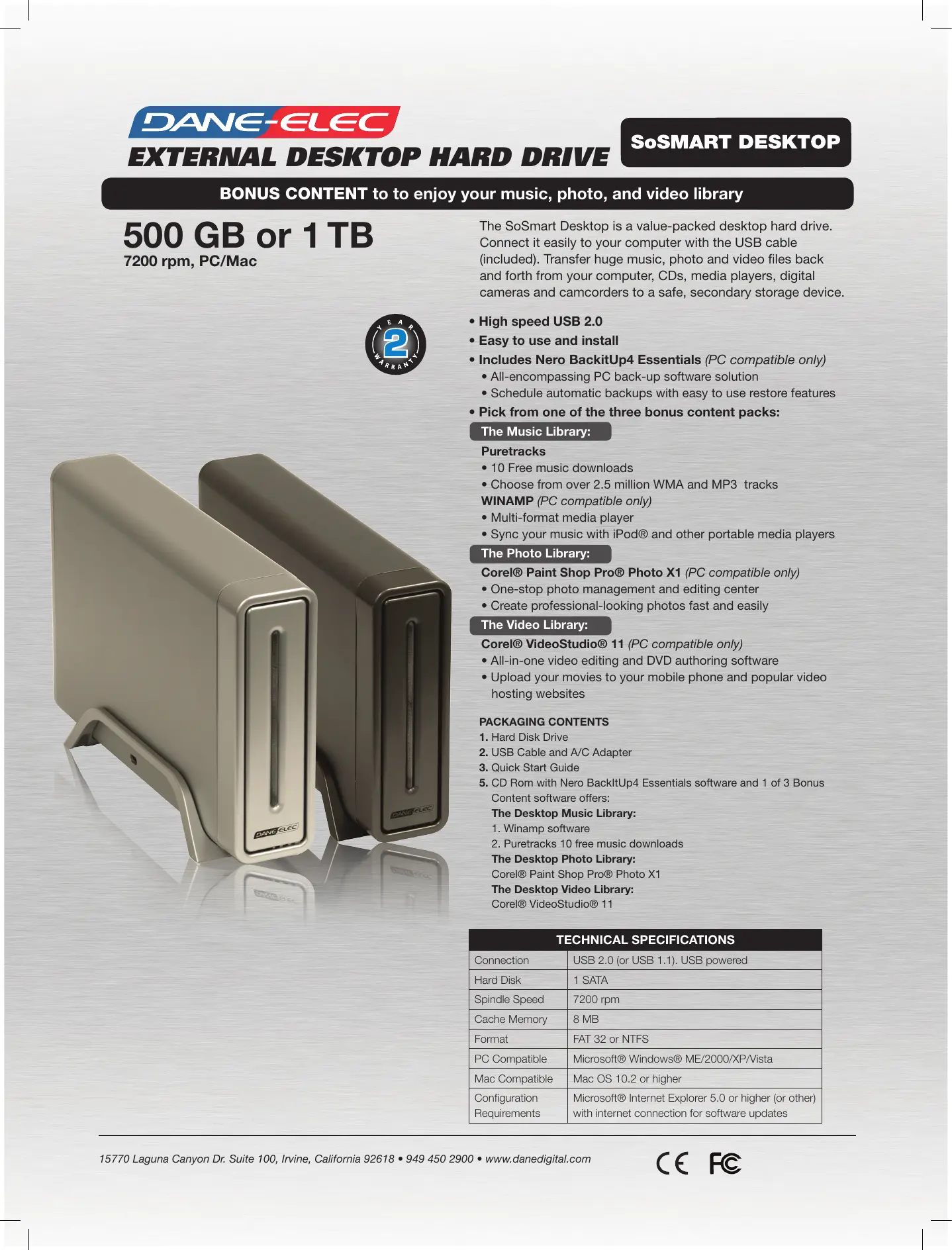 SoSMART DESKTOP 1 des 3 offres logiciel à choisir EN CADEAU! pour profiter au max de votre | musique, image et vidéo G T SoSmart Desktop est un disque dur de bureau. Connectez 500 O O U 1 O le facilement à votre ordinateur avec le câble USB (inclus). 7200 rpm, PC/Mac Sauvegardez vos fichiers audios, images et vidéos de votre ordinateur, CD audios, lecteur MP3, caméra digitale et vidéo caméra dans un stockage haute capacité fiable. + High speed USB 2.0 + Rapide à installer, facile à utiliser + Inclus Nero BackitUp4 Essentials (PC compatible uniquement) + Nouvelle version + Sauvegarde automatique de vos données avec mise à jour incrémetale et copie cachée + Choisissez parmi 1 des 3 offres EN CADEAU ci-dessous : The Music Library: Puretracks + 10 chansons gratuites à télécharger + Choisissez parmi plus de 2.5 million WMA et track MP3 WINAMP (PC compatible uniquement) + Lecteur multimédia + Syncronisez votre musique avec votre iPod® et d'autres lecteurs multimédia portables The Photo Library: Corel® Paint Shop Pro® Photo X1 (PC compatible uniquement) + Ensemble complet d'outils de gestion et d'édition des photos + Créez rapidement et facilement des photos professionnelles The Video Library: Corel® VideoStudio® 11 (PC compatible uniquement) + Ensemble complet d'outils d'édition vidéo et logiciel de lecture de DVD + Téléchargez vos vidéos sur votre téléphone portable et sur