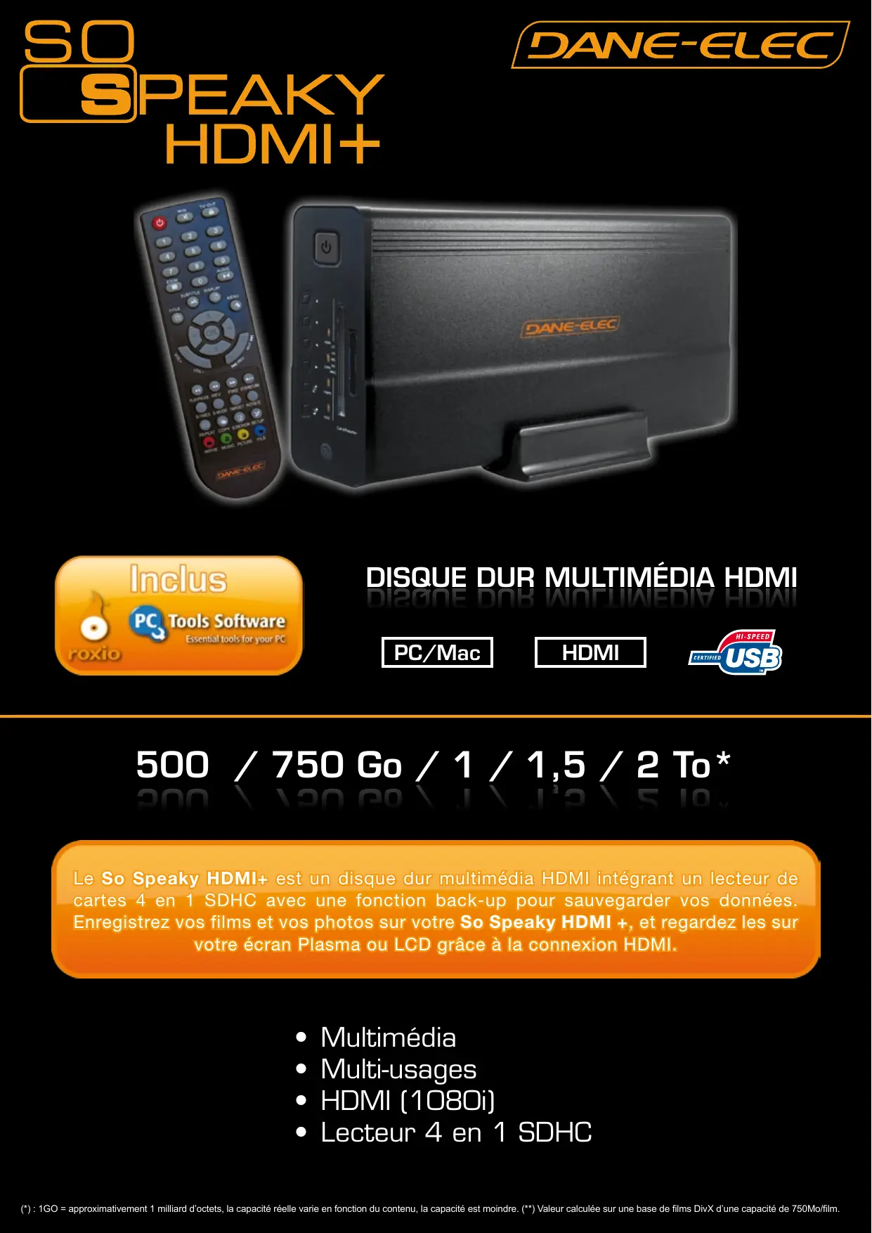 AE HDMI {usB 900 / 750 Go / 1 / 1,5 / 2 To* e Multimédia e Multi-usages e HDMI (1080) e Lecteur 4 en 1 SDHC {):1G0 = approximativement 1 miliard d'octets, la capacité réelle varie en fonction du contenu, la capacité est moindre. (**) Valeur calculée sur une base de films DivX d'une capacité de 750Mo/im.