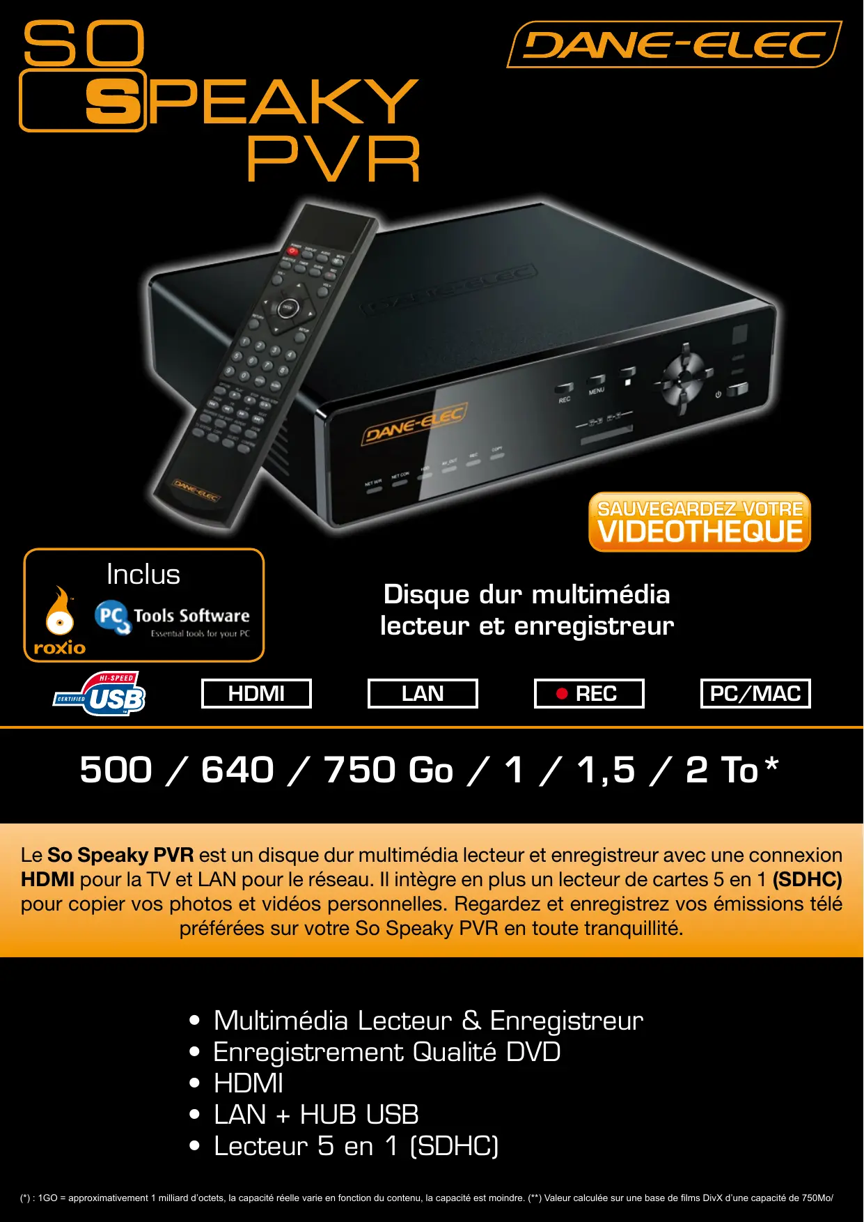 Disque dur multimédia Es tob ou PC lecteur et enregistreur roxio {uSB HDMI LAN e REC PC/MAC 900 / 640 / 750 Go / 1 / 1,5 / 2 To* Le So Speaky PVR est un disque dur multimédia lecteur et enregistreur avec une connexion HDMI pour la TV et LAN pour le réseau. Il intègre en plus un lecteur de cartes 5 en 1 (SDHC) pour copier vos photos et vidéos personnelles. Regardez et enregistrez vos émissions télé préférées sur votre So Speaky PVR en toute tranquillité. Multimédia Lecteur & Enregistreur Enregistrement Qualité DVD HDMI