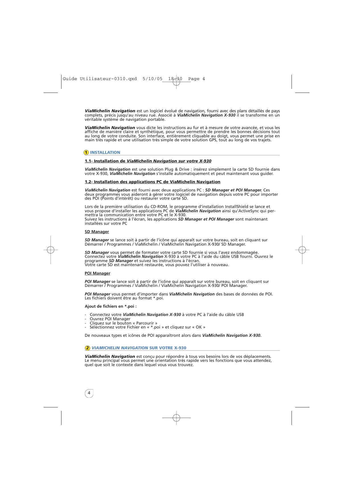 Guide Utilisateur-0310.qxd 5/10/05 18:30 Page 4 ViaMichelin Navigation est un logiciel évolué de navigation, fourni avec des plans détaillés de pays complets, précis jusqu’au niveau rue. Associé à ViaMichelin Navigation X-930 il se transforme en un véritable système de navigation portable. ViaMichelin Navigation vous dicte les instructions au fur et à mesure de votre avancée, et vous les affiche de manière claire et synthétique, pour vous permettre de prendre les bonnes décisions tout au long de votre conduite. Son interface, entièrement cliquable au doigt, vous permet une prise en main très rapide et une utilisation très simple de votre solution GPS, tout au long de vos trajets. 1 INSTALLATION 1.1- Installation de ViaMichelin Navigation sur votre X-930 ViaMichelin Navigation est une solution Plug & Drive : insérez simplement la carte SD fournie dans votre X-930, ViaMichelin Navigation s'installe automatiquement et peut maintenant vous guider. 1.2- Installation des applications PC de ViaMichelin Navigation ViaMichelin Navigation est fourni avec deux applications PC : SD Manager et POI Manager. Ces deux programmes vous aideront à gérer votre logiciel de navigation depuis votre PC pour importer des POI (Points d’intérêt) ou restaurer votre carte SD. Lors de la première utilisation du CD-ROM, le programme d’installation InstallShield se lance et vous propose d’installer les applications PC de ViaMichelin Navigation ainsi qu’ActiveSync qui permettra la communication entre votre PC et le X-930. Suivez les instructions à l’écran, les applications SD Manager et POI Manager sont maintenant installées sur votre PC SD Manager SD Manager se lance soit à partir de l’icône qui apparaît sur votre bureau, soit en cliquant sur Démarrer / Programmes / ViaMichelin / ViaMichelin Navigation X-930/ SD Manager. SD Manager vous permet de formater votre carte SD fournie si vous l’avez endommagée. Connectez votre ViaMichelin Navigation X-930 à votre PC à l’aide du câble USB fourni. Ouvrez le programme SD Manager et suivez les instructions à l’écran. Votre carte SD est maintenant restaurée, vous pouvez l’utiliser à nouveau. POI Manager POI Manager se lance soit à partir de l’icône qui apparaît sur votre bureau, soit en cliquant sur Démarrer / Programmes / ViaMichelin / ViaMichelin Navigation X-930/ POI Manager. POI Manager vous permet d’importer dans ViaMichelin Navigation des bases de données de POI. Les fichiers doivent être au format *.poi. Ajout de fichiers en *.poi :