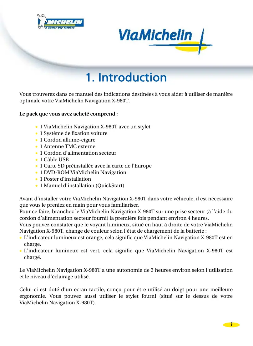 Vous trouverez dans ce manuel des indications destinées à vous aider à utiliser de manière optimale votre ViaMichelin Navigation X-980T. Le pack que vous avez acheté comprend :