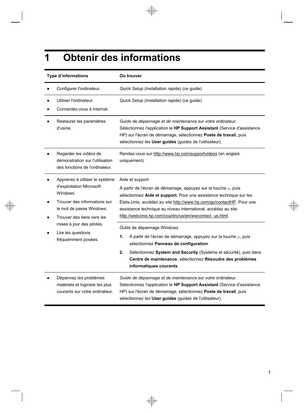 Site Web Assistance HP : http://www.hp.com/go/contactHP Recherchez les manuels de l’utilisateur électroniques et les caractéristiques de votre modèle d’ordinateur.