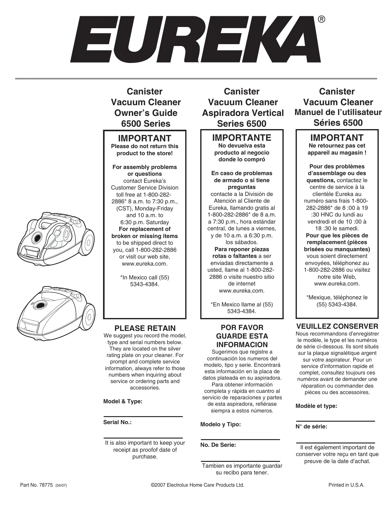 6500A - Aspirateur EUREKA - Notice d'utilisation et mode d'emploi gratuit