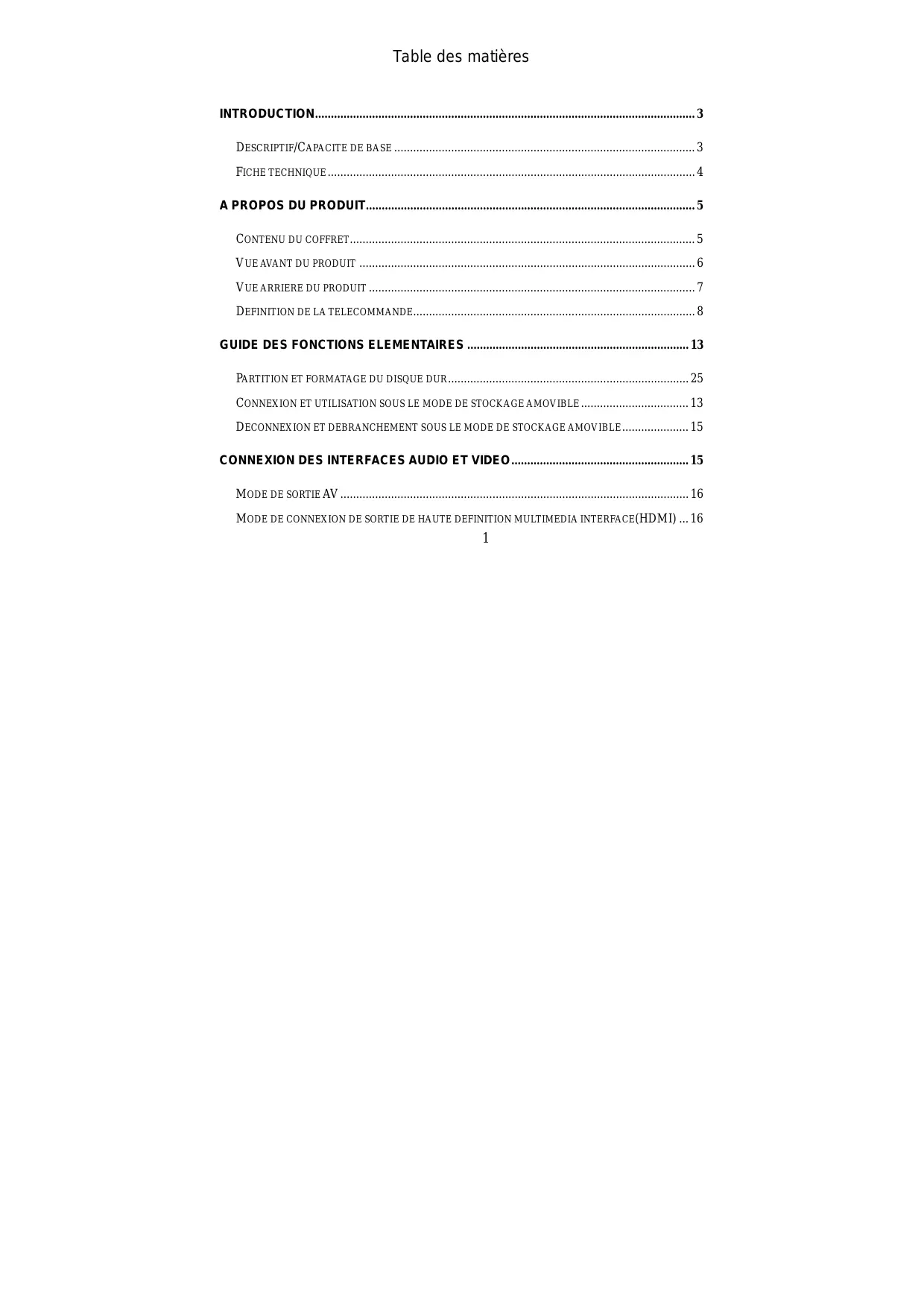 DESCRIPTIF/CAPACITE DE BASE 3 FICHE TECHNIQUE 4 DEFINITION DE LA TELECOMMANDE 8 GUIDE DES FONCTIONS ELEMENTAIRES 13 PARTITION ET FORMATAGE DU DISQUE DUR 25 CONNEXION ET UTILISATION SOUS LE MODE DE STOCKAGE AMOVIBLE 13 DECONNEXION ET DEBRANCHEMENT SOUS LE MODE DE STOCKAGE AMOVIBLE 15 CONNEXION DES INTERFACES AUDIO ET VIDEO 15 MODE DE SORTIE AV 16 MODE DE CONNEXION DE SORTIE DE HAUTE DEFINITION MULTIMEDIA INTERFACE(HDMI) ... 16