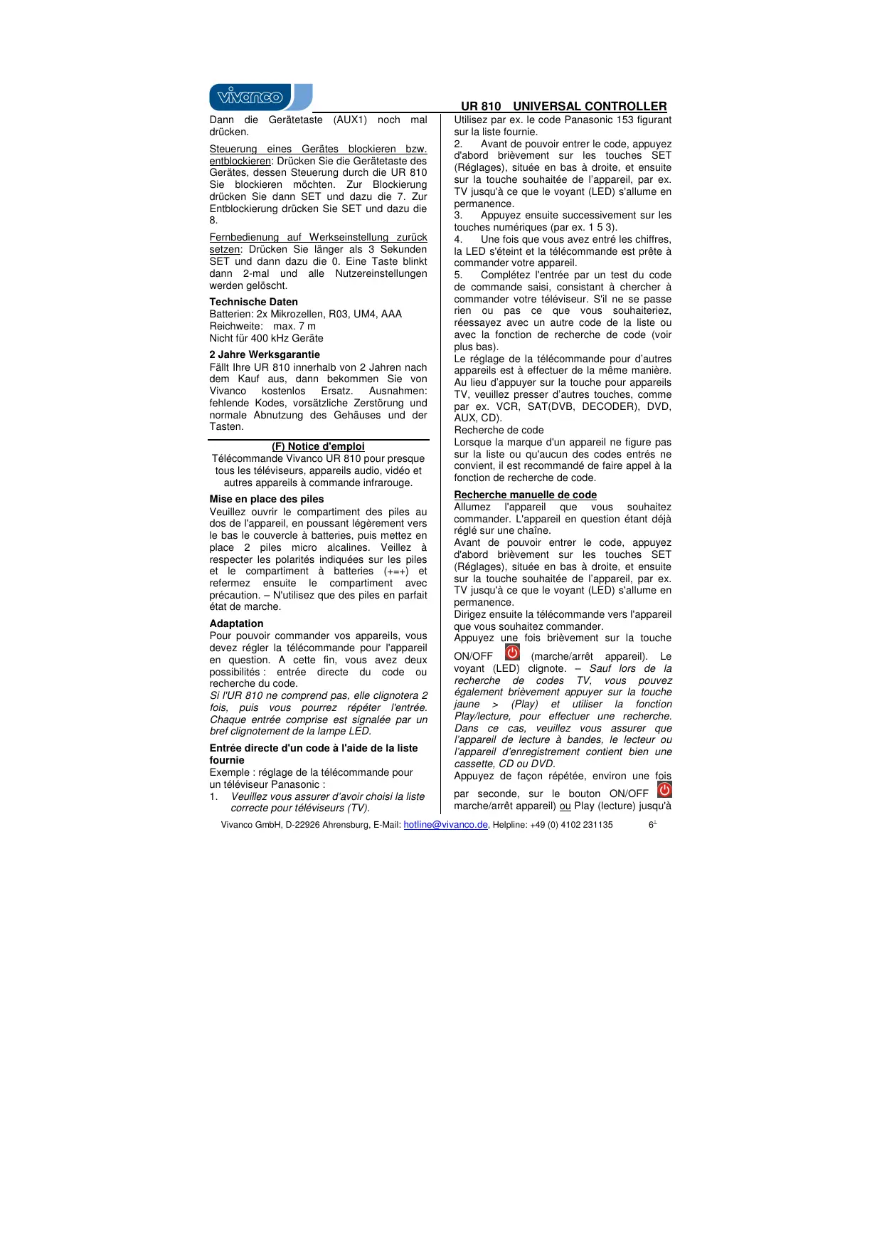 Changement de l’attribution d’appareil Les touches de choix d’appareil de la UR 810 TV, SAT etc. sont programmées pour des catégories d’appareils précis, par ex. pour TV, SAT etc.. Cette attribution peut être changée. Vous pouvez par ex. transformer la touche AUX1 en une deuxième touche SAT : a) Veuillez appuyer sur SET et sur la touche d’appareil à changer, par ex. AUX1. Ensuite relâcher les deux touches. AUX1 clignote. b) Appuyer sur la touche SAT et le voyant LED s’éteint. Sous AUX1 vous pouvez maintenant indiquer un deuxième code de commande pour SAT/DVB/câble. c) Vous pouvez annuler le changement de l’attribution en appuyant sur la touche SET et sur la touche modifiée, par ex. AUX1, aussi longtemps que la touche (AUX1) clignote. Ensuite, veuillez appuyer de nouveau sur la touche d’appareil (AUX1). Bloquer ou débloquer la commande d’un appareil : Appuyez sur la touche de l’appareil, dont vous souhaitez bloquer la commande avec la UR 810. Pour activer le blocage, veuillez ensuite appuyer sur les touches SET et 7. Pour débloquer, appuyez sur les touches SET et 8. Rétablir la configuration d’origine de la télécommande : Appuyez pendant plus de 3 secondes sur la touche SET et ensuite 0. Une touche clignote ensuite 2 fois et tous les réglages personnels seront effacés. Données techniques Batteries : 2 x piles, R03, UM4, AAA Portée : max. 7 m Non adapté pour appareils de 400 kHz Garantie d'usine de 2 ans En cas de défaut de votre UR 810 pendant une période de 2 ans à compter de la date d'achat, Vivanco la remplacera gratuitement. Exceptions : codes manquants, destruction intentionnelle et usure normale du boîtier et des touches.