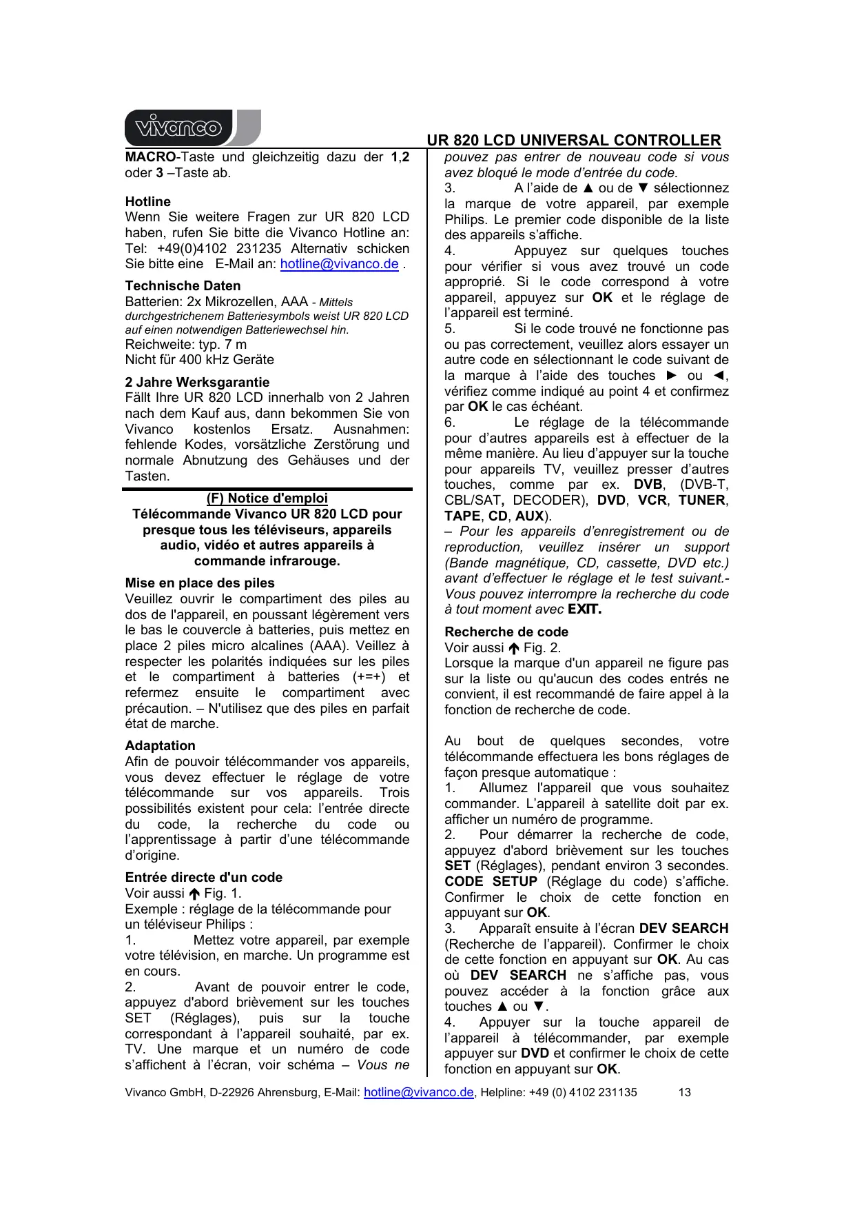 Nicht für 400 kHz Geräte 2 Jahre Werksgarantie Fällt Ihre UR 820 LCD innerhalb von 2 Jahren nach dem Kauf aus, dann bekommen Sie von Vivanco kostenlos Ersatz. Ausnahmen: fehlende Kodes, vorsätzliche Zerstörung und normale Abnutzung des Gehäuses und der Tasten. (F) Notice d'emploi Télécommande Vivanco UR 820 LCD pour presque tous les téléviseurs, appareils audio, vidéo et autres appareils à commande infrarouge. Mise en place des piles Veuillez ouvrir le compartiment des piles au dos de l'appareil, en poussant légèrement vers le bas le couvercle à batteries, puis mettez en place 2 piles micro alcalines (AAA). Veillez à respecter les polarités indiquées sur les piles et le compartiment à batteries (+=+) et refermez ensuite le compartiment avec précaution. – N'utilisez que des piles en parfait état de marche. Adaptation Afin de pouvoir télécommander vos appareils, vous devez effectuer le réglage de votre télécommande sur vos appareils. Trois possibilités existent pour cela: l’entrée directe du code, la recherche du code ou l’apprentissage à partir d’une télécommande d’origine. Entrée directe d'un code Voir aussi Ï Fig. 1. Exemple : réglage de la télécommande pour un téléviseur Philips : 1. Mettez votre appareil, par exemple votre télévision, en marche. Un programme est en cours. 2. Avant de pouvoir entrer le code, appuyez d'abord brièvement sur les touches SET (Réglages), puis sur la touche correspondant à l’appareil souhaité, par ex. TV. Une marque et un numéro de code s’affichent à l’écran, voir schéma – Vous ne