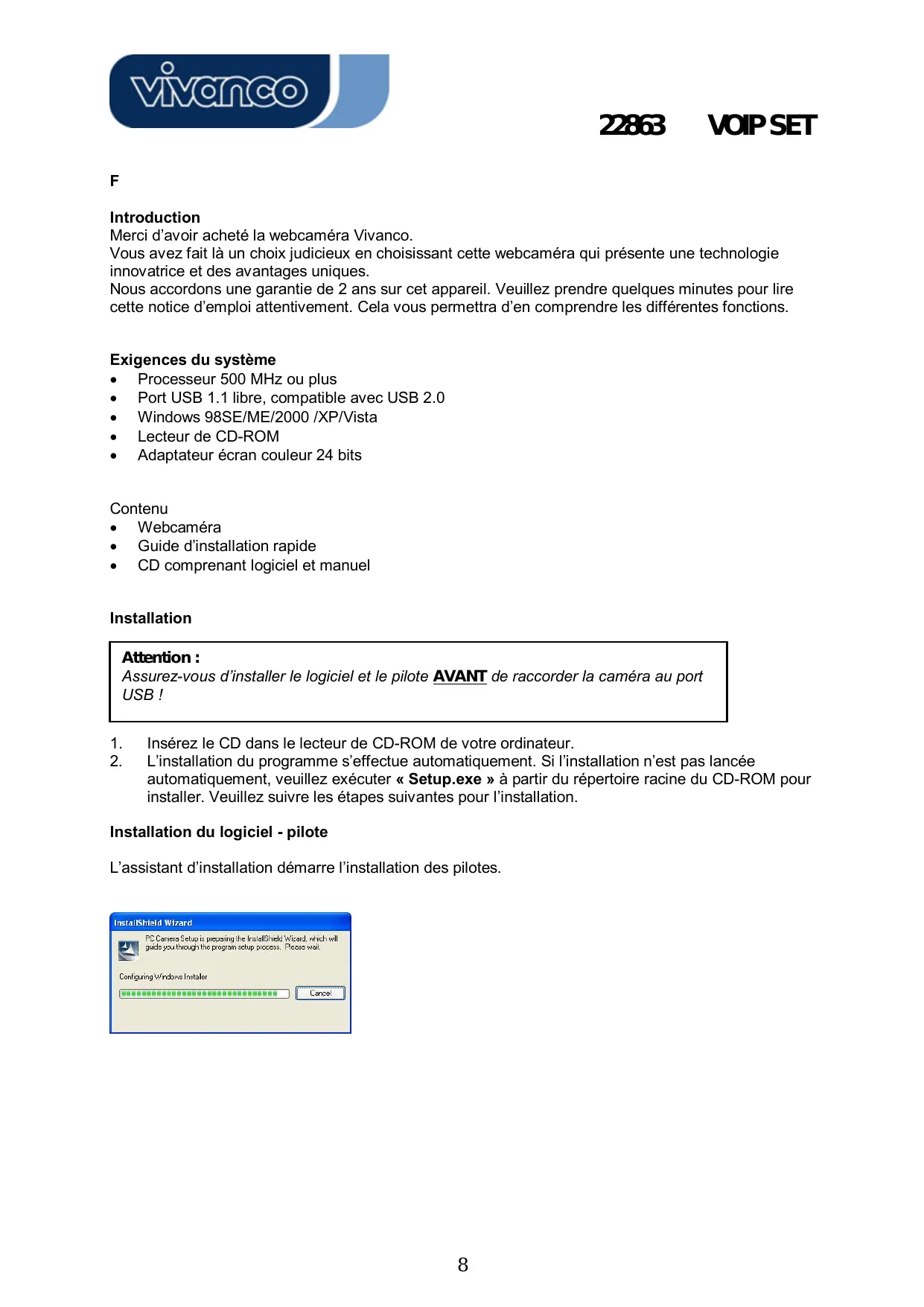 F Introduction Merci d’avoir acheté la webcaméra Vivanco. Vous avez fait là un choix judicieux en choisissant cette webcaméra qui présente une technologie innovatrice et des avantages uniques. Nous accordons une garantie de 2 ans sur cet appareil. Veuillez prendre quelques minutes pour lire cette notice d’emploi attentivement. Cela vous permettra d’en comprendre les différentes fonctions. Exigences du système • Processeur 500 MHz ou plus • Port USB 1.1 libre, compatible avec USB 2.0 • Windows 98SE/ME/2000 /XP/Vista • Lecteur de CD-ROM • Adaptateur écran couleur 24 bits Contenu • Webcaméra • Guide d’installation rapide • CD comprenant logiciel et manuel Installation Attention : Assurez-vous d’installer le logiciel et le pilote AVANT de raccorder la caméra au port USB ! 1. 2.