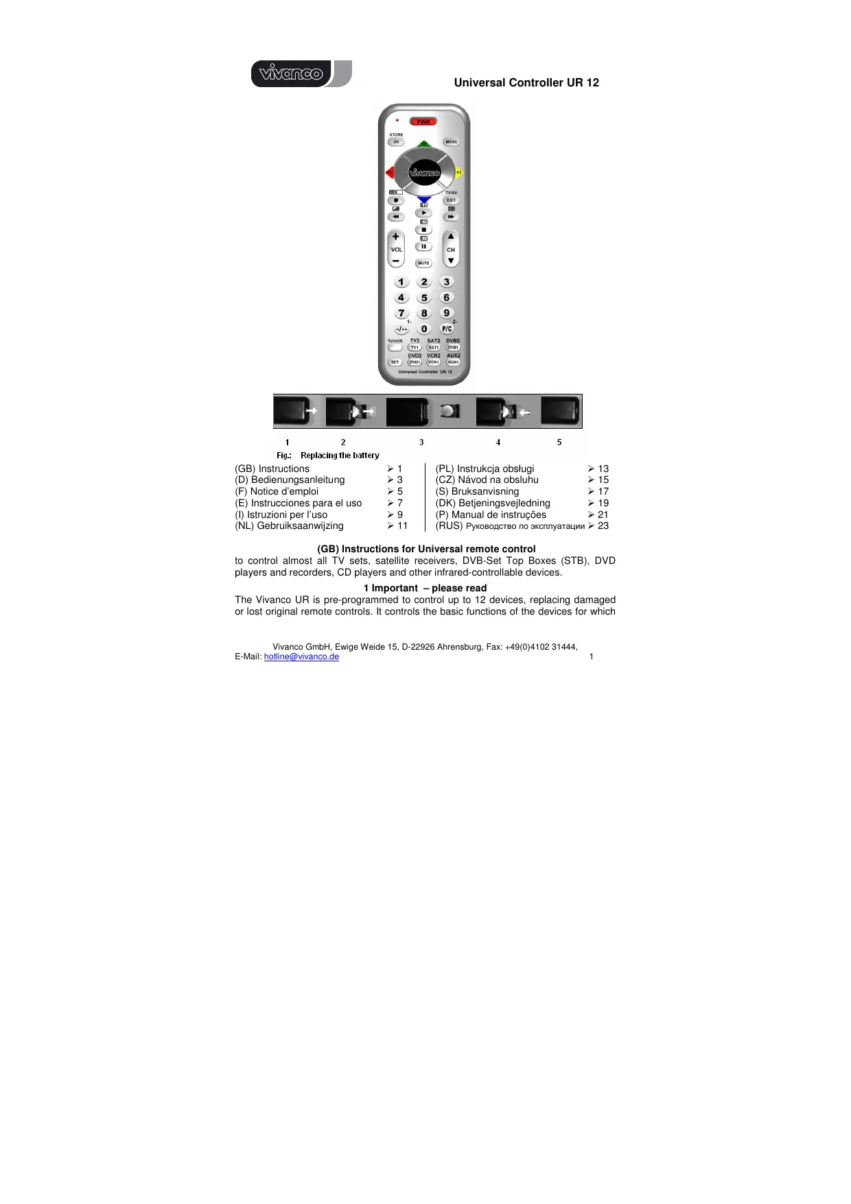 Retrouvez gratuitement la notice de l'appareil UNIVERSAL CONTROLLER UR 12 VIVANCO au format PDF.