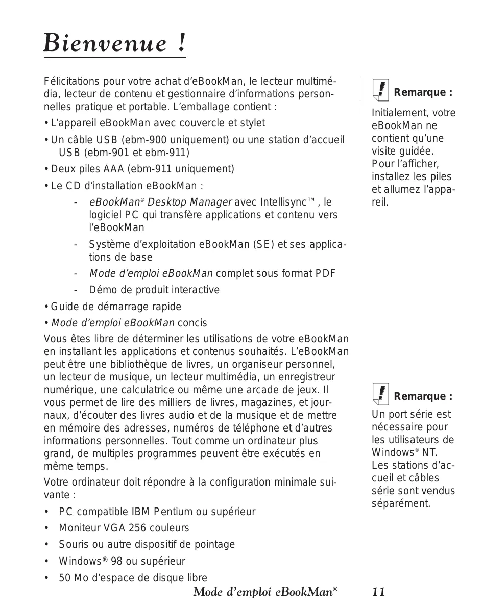 50 Mo d’espace de disque libre Mode d’emploi eBookMan® Remarque : Un port série est nécessaire pour les utilisateurs de Windows® NT. Les stations d’accueil et câbles série sont vendus séparément.