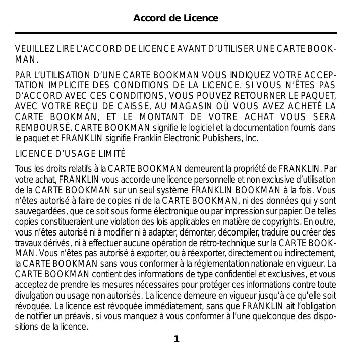 Tous les droits relatifs à la CARTE BOOKMAN demeurent la propriété de FRANKLIN. Par votre achat, FRANKLIN vous accorde une licence personnelle et non exclusive d’utilisation de la CARTE BOOKMAN sur un seul système FRANKLIN BOOKMAN à la fois. Vous n’êtes autorisé à faire de copies ni de la CARTE BOOKMAN, ni des données qui y sont sauvegardées, que ce soit sous forme électronique ou par impression sur papier. De telles copies constitueraient une violation des lois applicables en matière de copyrights. En outre, vous n’êtes autorisé ni à modifier ni à adapter, démonter, décompiler, traduire ou créer des travaux dérivés, ni à effectuer aucune opération de rétro-technique sur la CARTE BOOKMAN. Vous n’êtes pas autorisé à exporter, ou à réexporter, directement ou indirectement, la CARTE BOOKMAN sans vous conformer à la réglementation nationale en vigueur. La CARTE BOOKMAN contient des informations de type confidentiel et exclusives, et vous acceptez de prendre les mesures nécessaires pour protéger ces informations contre toute divulgation ou usage non autorisés. La licence demeure en vigueur jusqu’à ce qu’elle soit révoquée. La licence est révoquée immédiatement, sans que FRANKLIN ait l’obligation de notifier un préavis, si vous manquez à vous conformer à l’une quelconque des dispositions de la licence.