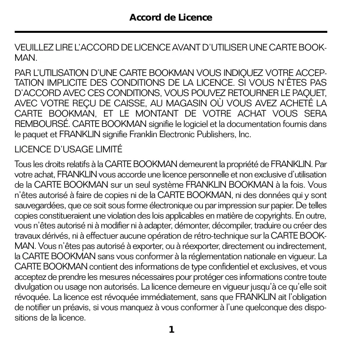 Tous les droits relatifs à la CARTE BOOKMAN demeurent la propriété de FRANKLIN. Par votre achat, FRANKLIN vous accorde une licence personnelle et non exclusive d'utilisation de la CARTE BOOKMAN sur un seul système FRANKLIN BOOKMAN à la fois. Vous n'êtes autorisé à faire de copies ni de la CARTE BOOKMAN, ni des données qui y sont sauvegardées, que ce soit sous forme électronique ou par impression sur papier. De telles copies constitueraient une violation des lois applicables en matière de copyrights. En outre, vous n'êtes autorisé ni à modifier ni à adapter, démonter, décompiler, traduire ou créer des travaux dérivés, ni à effectuer aucune opération de rétro-technique sur la CARTE BOOK- MAN. Vous n'êtes pas autorisé à exporter, ou à réexporter, directement ou indirectement, la CARTE BOOKMAN sans vous conformer à la réglementation nationale en vigueur. La CARTE BOOKMAN contient des informations de type confidentiel et exclusives, et vous acceptez de prendre les mesures nécessaires pour protéger ces informations contre toute divulgation ou usage non autorisés. La licence demeure en vigueur jusqu'à ce qu'elle soit révoquée. La licence est révoquée immédiatement, sans que FRANKLIN ait l'obligation de notifier un préavis, si vous manquez à vous conformer à l'une quelconque des dispo- sitions de la licence.