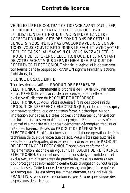 Contrat de licence VEUILLEZ LIRE LE CONTRAT CE LICENCE AVANT D’UTILISER CE PRODUIT CE RÉFÉRENCE ÉLECTRONIQUE. PAR L’UTILISATION DE CE PRODUIT, VOUS INDIQUEZ VOTRE ACCEPTATION IMPLICITE DES CONDITIONS DE CETTE LICENCE. SI VOUS N’ÊTES PAS D’ACCORD AVEC CES CONDITIONS, VOUS POUVEZ RETOURNER LE PAQUET, AVEC VOTRE REÇU DE CAISSE, AU MAGASIN OÙ VOUS AVEZ ACHETÉ LE PRODUIT DE RÉFÉRENCE ÉLECTRONIQUE, ET LE MONTANT DE VOTRE ACHAT VOUS SERA REMBOURSÉ. PRODUIT DE RÉFÉRENCE ÉLECTRONIQUE signifie le logiciel et la documentation fournis dans le paquet et FRANKLIN signifie Franklin Electronic Publishers, Inc.