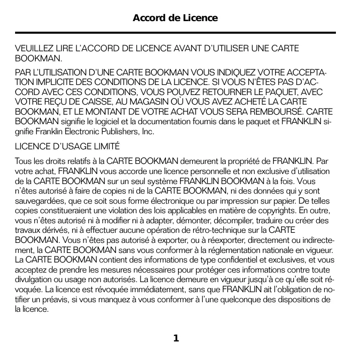 Tous les droits relatifs à la CARTE BOOKMAN demeurent la propriété de FRANKLIN. Par votre achat, FRANKLIN vous accorde une licence personnelle et non exclusive d’utilisation de la CARTE BOOKMAN sur un seul système FRANKLIN BOOKMAN à la fois. Vous n’êtes autorisé à faire de copies ni de la CARTE BOOKMAN, ni des données qui y sont sauvegardées, que ce soit sous forme électronique ou par impression sur papier. De telles copies constitueraient une violation des lois applicables en matière de copyrights. En outre, vous n’êtes autorisé ni à modifier ni à adapter, démonter, décompiler, traduire ou créer des travaux dérivés, ni à effectuer aucune opération de rétro-technique sur la CARTE BOOKMAN. Vous n’êtes pas autorisé à exporter, ou à réexporter, directement ou indirectement, la CARTE BOOKMAN sans vous conformer à la réglementation nationale en vigueur. La CARTE BOOKMAN contient des informations de type confidentiel et exclusives, et vous acceptez de prendre les mesures nécessaires pour protéger ces informations contre toute divulgation ou usage non autorisés. La licence demeure en vigueur jusqu’à ce qu’elle soit révoquée. La licence est révoquée immédiatement, sans que FRANKLIN ait l’obligation de notifier un préavis, si vous manquez à vous conformer à l’une quelconque des dispositions de la licence.
