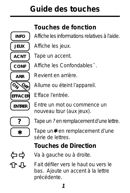 Guide des touches Touches de fonction INFO Affiche les informations relatives à l’aide. JEUX Affiche les jeux. ACNT Tape un accent. CONF Affiche les Confondables™. ARR