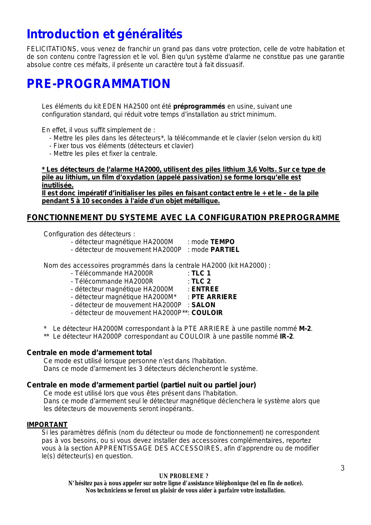 - Garantie UN PROBLEME ? N’hésitez pas à nous appeler sur notre ligne d’assistance téléphonique (tel en fin de notice). Nos techniciens se feront un plaisir de vous aider à parfaire votre installation. Introduction et généralités FELICITATIONS, vous venez de franchir un grand pas dans votre protection, celle de votre habitation et de son contenu contre l'agression et le vol. Bien qu'un système d'alarme ne constitue pas une garantie absolue contre ces méfaits, il présente un caractère tout à fait dissuasif. PRE-PROGRAMMATION Les éléments du kit EDEN HA2500 ont été préprogrammés en usine, suivant une configuration standard, qui réduit votre temps d’installation au strict minimum. En effet, il vous suffit simplement de : - Mettre les piles dans les détecteurs*, la télécommande et le clavier (selon version du kit) - Fixer tous vos éléments (détecteurs et clavier) - Mettre les piles et fixer la centrale. p. 53