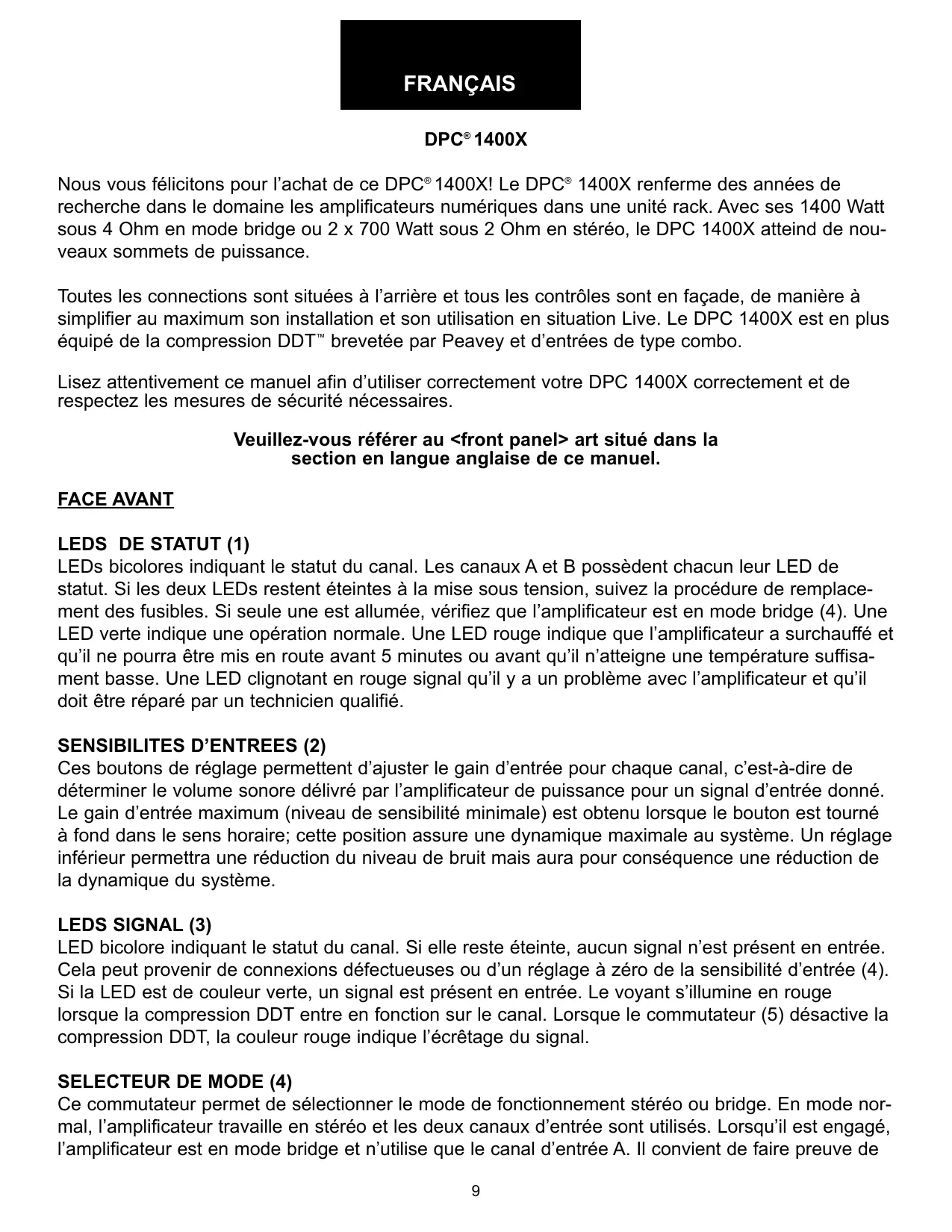 Monitor Input EQ™215FX FRANÇAIS DPC® 1400X Nous vous félicitons pour l’achat de ce DPC® 1400X! Le DPC® 1400X renferme des années de recherche dans le domaine les amplificateurs numériques dans une unité rack. Avec ses 1400 Watt sous 4 Ohm en mode bridge ou 2 x 700 Watt sous 2 Ohm en stéréo, le DPC 1400X atteind de nouveaux sommets de puissance. Toutes les connections sont situées à l’arrière et tous les contrôles sont en façade, de manière à simplifier au maximum son installation et son utilisation en situation Live. Le DPC 1400X est en plus équipé de la compression DDT™ brevetée par Peavey et d’entrées de type combo. Lisez attentivement ce manuel afin d’utiliser correctement votre DPC 1400X correctement et de respectez les mesures de sécurité nécessaires. Veuillez-vous référer au <front panel> art situé dans la section en langue anglaise de ce manuel. FACE AVANT LEDS DE STATUT (1) LEDs bicolores indiquant le statut du canal. Les canaux A et B possèdent chacun leur LED de statut. Si les deux LEDs restent éteintes à la mise sous tension, suivez la procédure de remplacement des fusibles. Si seule une est allumée, vérifiez que l’amplificateur est en mode bridge (4). Une LED verte indique une opération normale. Une LED rouge indique que l’amplificateur a surchauffé et qu’il ne pourra être mis en route avant 5 minutes ou avant qu’il n’atteigne une température suffisament basse. Une LED clignotant en rouge signal qu’il y a un problème avec l’amplificateur et qu’il doit être réparé par un technicien qualifié. SENSIBILITES D’ENTREES (2) Ces boutons de réglage permettent d’ajuster le gain d’entrée pour chaque canal, c’est-à-dire de déterminer le volume sonore délivré par l’amplificateur de puissance pour un signal d’entrée donné. Le gain d’entrée maximum (niveau de sensibilité minimale) est obtenu lorsque le bouton est tourné à fond dans le sens horaire; cette position assure une dynamique maximale au système. Un réglage inférieur permettra une réduction du niveau de bruit mais aura pour conséquence une réduction de la dynamique du système. LEDS SIGNAL (3) LED bicolore indiquant le statut du canal. Si elle reste éteinte, aucun signal n’est présent en entrée. Cela peut provenir de connexions défectueuses ou d’un réglage à zéro de la sensibilité d’entrée (4). Si la LED est de couleur verte, un signal est présent en entrée. Le voyant s’illumine en rouge lorsque la compression DDT entre en fonction sur le canal. Lorsque le commutateur (5) désactive la compression DDT, la couleur rouge indique l’écrêtage du signal. SELECTEUR DE MODE (4) Ce commutateur permet de sélectionner le mode de fonctionnement stéréo ou bridge. En mode normal, l’amplificateur travaille en stéréo et les deux canaux d’entrée sont utilisés. Lorsqu’il est engagé, l’amplificateur est en mode bridge et n’utilise que le canal d’entrée A. Il convient de faire preuve de