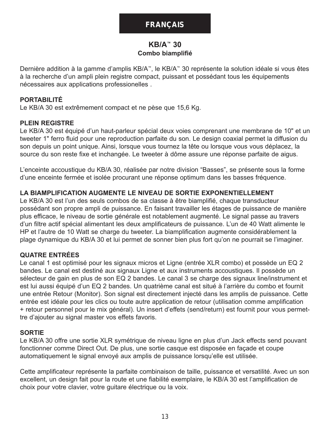 Combo biamplifiŽ Derni•re addition ˆ la gamme dÕamplis KB/Aª, le KB/Aª 30 reprŽsente la solution idŽale si vous •tes ˆ la recherche dÕun ampli plein registre compact, puissant et possŽdant tous les Žquipements nŽcessaires aux applications professionelles . PORTABILITƒ Le KB/A 30 est extr•mement compact et ne p•se que 15,6 Kg. PLEIN REGISTRE Le KB/A 30 est ŽquipŽ dÕun haut-parleur spŽcial deux voies comprenant une membrane de 10" et un tweeter 1" ferro fluid pour une reproduction parfaite du son. Le design coaxial permet la diffusion du son depuis un point unique. Ainsi, lorsque vous tournez la t•te ou lorsque vous vous dŽplacez, la source du son reste fixe et inchangŽe. Le tweeter ˆ d™me assure une rŽponse parfaite de aigus. LÕenceinte accoustique du KB/A 30, rŽalisŽe par notre division ÒBassesÓ, se prŽsente sous la forme dÕune enceinte fermŽe et isolŽe procurant une rŽponse optimum dans les basses frŽquence. LA BIAMPLIFICATION AUGMENTE LE NIVEAU DE SORTIE EXPONENTIELLEMENT Le KB/A 30 est lÕun des seuls combos de sa classe ˆ •tre biamplifiŽ, chaque transducteur possŽdant son propre ampli de puissance. En faisant travailler les Žtages de puissance de mani•re plus efficace, le niveau de sortie gŽnŽrale est notablement augmentŽ. Le signal passe au travers dÕun filtre actif spŽcial alimentant les deux amplificateurs de puissance. LÕun de 40 Watt alimente le HP et lÕautre de 10 Watt se charge du tweeter. La biamplification augmente considŽrablement la plage dynamique du KB/A 30 et lui permet de sonner bien plus fort quÕon ne pourrait se lÕimaginer. QUATRE ENTRƒES Le canal 1 est optimisŽ pour les signaux micros et Ligne (entrŽe XLR combo) et poss•de un EQ 2 bandes. Le canal est destinŽ aux signaux Ligne et aux instruments accoustiques. Il poss•de un sŽlecteur de gain en plus de son EQ 2 bandes. Le canal 3 se charge des signaux line/instrument et est lui aussi ŽquipŽ dÕun EQ 2 bandes. Un quatri•me canal est situŽ ˆ lÕarri•re du combo et fournit une entrŽe Retour (Monitor). Son signal est directement injectŽ dans les amplis de puissance. Cette entrŽe est idŽale pour les clics ou toute autre application de retour (utilisation comme amplification + retour personnel pour le mix gŽnŽral). Un insert dÕeffets (send/return) est fournit pour vous permettre dÕajouter au signal master vos effets favoris. SORTIE Le KB/A 30 offre une sortie XLR symŽtrique de niveau ligne en plus dÕun Jack effects send pouvant fonctionner comme Direct Out. De plus, une sortie casque est disposŽe en fa•ade et coupe automatiquement le signal envoyŽ aux amplis de puissance lorsquÕelle est utilisŽe. Cette amplificateur reprŽsente la parfaite combinaison de taille, puissance et versatilitŽ. Avec un son excellent, un design fait pour la route et une fiabilitŽ exemplaire, le KB/A 30 est lÕamplification de choix pour votre clavier, votre guitare Žlectrique ou la voix.