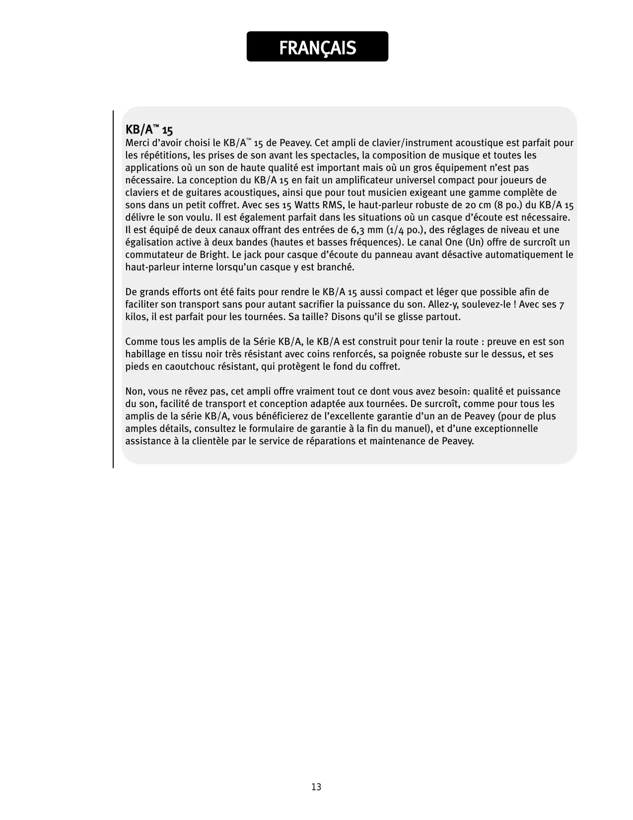 FRANÇAIS KB/A™ 15 Merci d’avoir choisi le KB/A™ 15 de Peavey. Cet ampli de clavier/instrument acoustique est parfait pour les répétitions, les prises de son avant les spectacles, la composition de musique et toutes les applications où un son de haute qualité est important mais où un gros équipement n’est pas nécessaire. La conception du KB/A 15 en fait un amplificateur universel compact pour joueurs de claviers et de guitares acoustiques, ainsi que pour tout musicien exigeant une gamme complète de sons dans un petit coffret. Avec ses 15 Watts RMS, le haut-parleur robuste de 20 cm (8 po.) du KB/A 15 délivre le son voulu. Il est également parfait dans les situations où un casque d’écoute est nécessaire. Il est équipé de deux canaux offrant des entrées de 6,3 mm (1/4 po.), des réglages de niveau et une égalisation active à deux bandes (hautes et basses fréquences). Le canal One (Un) offre de surcroît un commutateur de Bright. Le jack pour casque d’écoute du panneau avant désactive automatiquement le haut-parleur interne lorsqu’un casque y est branché. De grands efforts ont été faits pour rendre le KB/A 15 aussi compact et léger que possible afin de faciliter son transport sans pour autant sacrifier la puissance du son. Allez-y, soulevez-le ! Avec ses 7 kilos, il est parfait pour les tournées. Sa taille? Disons qu’il se glisse partout. Comme tous les amplis de la Série KB/A, le KB/A est construit pour tenir la route : preuve en est son habillage en tissu noir très résistant avec coins renforcés, sa poignée robuste sur le dessus, et ses pieds en caoutchouc résistant, qui protègent le fond du coffret. Non, vous ne rêvez pas, cet ampli offre vraiment tout ce dont vous avez besoin: qualité et puissance du son, facilité de transport et conception adaptée aux tournées. De surcroît, comme pour tous les amplis de la série KB/A, vous bénéficierez de l’excellente garantie d’un an de Peavey (pour de plus amples détails, consultez le formulaire de garantie à la fin du manuel), et d’une exceptionnelle assistance à la clientèle par le service de réparations et maintenance de Peavey.