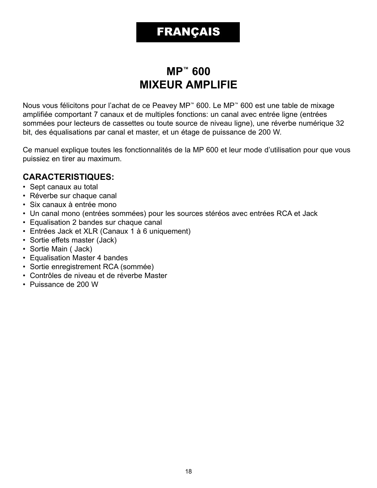 FRANÇAIS MP™ 600 MIXEUR AMPLIFIE Nous vous félicitons pour l’achat de ce Peavey MP™ 600. Le MP™ 600 est une table de mixage amplifiée comportant 7 canaux et de multiples fonctions: un canal avec entrée ligne (entrées sommées pour lecteurs de cassettes ou toute source de niveau ligne), une réverbe numérique 32 bit, des équalisations par canal et master, et un étage de puissance de 200 W. Ce manuel explique toutes les fonctionnalités de la MP 600 et leur mode d’utilisation pour que vous puissiez en tirer au maximum. CARACTERISTIQUES: