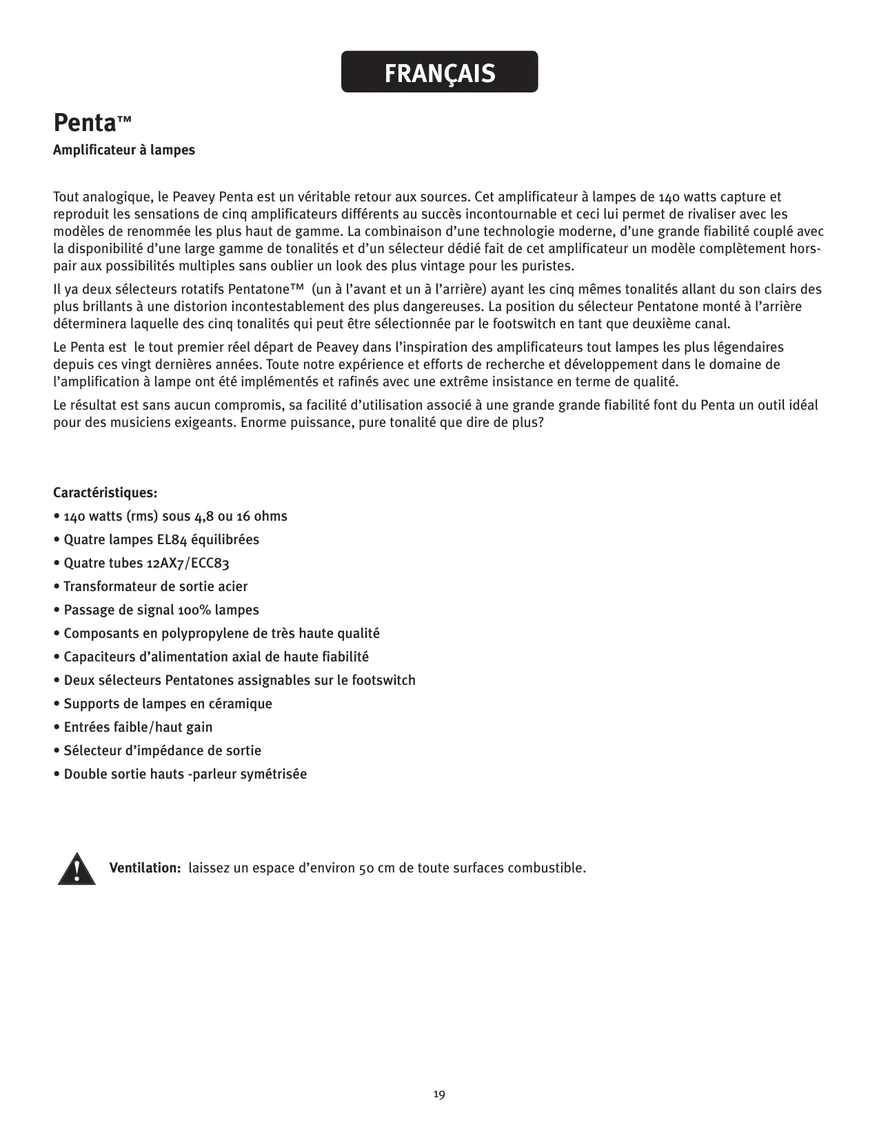 Ce symbole est utilisé dans ce manuel pour indiquer à l’utilisateur la présence d’une tension dangereuse pouvant être d’amplitude suffisante pour constituer un risque de choc électrique. Ce symbole est utilisé dans ce manuel pour indiquer à l’utilisateur qu’il ou qu’elle trouvera d’importantes instructions concernant l’utilisation et l’entretien de l’appareil dans le paragraphe signalé. ATTENTION: Risques de choc électrique — NE PAS OUVRIR! ATTENTION: Afin de réduire le risque de choc électrique, ne pas enlever le couvercle. Il ne se trouve à l’intérieur aucune pièce pouvant être reparée par l’utilisateur. Confiez I’entretien et la réparation de l’appareil à un réparateur Peavey agréé. AVIS: Dans le but de reduire les risques d’incendie ou de decharge electrique, cet appareil ne doit pas etre expose a la pluie ou a l’humidite et aucun objet rempli de liquide, tel qu’un vase, ne doit etre pose sur celui-ci. Avant d’utiliser de cet appareil, lisez attentivement le guide fonctionnant pour avertissements supplémentaires. Dieses Symbol soll den Anwender vor unisolierten gefährlichen Spannungen innerhalb des Gehäuses warnen, die von Ausreichender Stärke sind, um einen elektrischen Schlag verursachen zu können. Dieses Symbol soll den Benutzer auf wichtige Instruktionen in der Bedienungsanleitung aufmerksam machen, die Handhabung und Wartung des Produkts betreffen. VORSICHT: Risiko — Elektrischer Schlag! Nicht öffnen! Prétez attention aux messages de précautions de ce manuel. Suivez ces instructions. N’utilisez pas cette unité proche de plans d’eau. N’utilisez qu’un tissu sec pour le nettoyage de votre unité. N’obstruez pas les systèmes de refroidissement de votre unité et installez votre unité en fonction des instructions de ce manuel. Ne positionnez pas votre unité à proximité de toute source de chaleur. Connectez toujours votre unité sur une alimentation munie de prise de terre utilisant le cordon d’alimentation fourni. Protégez les connecteurs de votre unité et positionnez les cablages pour éviter toutes déconnexions accidentelles. N’utilisez que des fixations approuvées par le fabriquant. Lors de l’utilsation sur pied ou pole de support, assurez dans le cas de déplacement de l’ensemble enceinte/ support de prévenir tout basculement intempestif de celui-ci. Il est conseillé de déconnecter du secteur votre unité en cas d’orage ou de durée prolongée sans utilisation. Seul un technicien agréé par le fabriquant est à même de réparer/contrôler votre unité. Celle-ci doit être contrôlée si elle a subit des dommages de manipulation, d’utilisation ou de stockage (humidité,…). Ne déconnectez jamais la prise de terre de votre unité. Si votre unité est destinée a etre montée en rack, des supports arriere doivent etre utilises. Note pour les Royaumes-Unis: Si les couleurs de connecteurs du cable d’alimentation ne correspond pas au guide de la prise secteur, procédez comme suit: a) Le connecteur vert et jaune doit être connectrer au terminal noté E, indiquant la prise de terre ou correspondant aux couleurs verte ou verte et jaune du guide. b) Le connecteur Bleu doit être connectrer au terminal noté N, correspondnat à la couleur noire du guide. c) Le connecteur marron doit être connectrer au terminal noté L, correspondant à la couleur rouge du guide. Cet équipement électrique ne doit en aucun cas être en contact avec un quelconque liquide et aucun objet contenant un liquide, vase ou autre ne devrait être posé sur celui-ci. Une exposition à de hauts niveaux sonores peut conduire à des dommages de l’écoute irréversibles. La susceptibilité au bruit varie considérablement d’un individu à l’autre, mais une large majorité de la population expériencera une perte de l’écoute après une exposition à une forte puissance sonore pour une durée prolongée. L’organisme de la santé américaine (OSHA) a produit le guide ci-dessous en rapport à la perte occasionnée: Durée par Jour (heures) 8 6 4 Il ya deux sélecteurs rotatifs Pentatone™ (un à l’avant et un à l’arrière) ayant les cinq mêmes tonalités allant du son clairs des plus brillants à une distorion incontestablement des plus dangereuses. La position du sélecteur Pentatone monté à l’arrière déterminera laquelle des cinq tonalités qui peut être sélectionnée par le footswitch en tant que deuxième canal. Le Penta est le tout premier réel départ de Peavey dans l’inspiration des amplificateurs tout lampes les plus légendaires depuis ces vingt dernières années. Toute notre expérience et efforts de recherche et développement dans le domaine de l’amplification à lampe ont été implémentés et rafinés avec une extrême insistance en terme de qualité. Le résultat est sans aucun compromis, sa facilité d’utilisation associé à une grande grande fiabilité font du Penta un outil idéal pour des musiciens exigeants. Enorme puissance, pure tonalité que dire de plus?