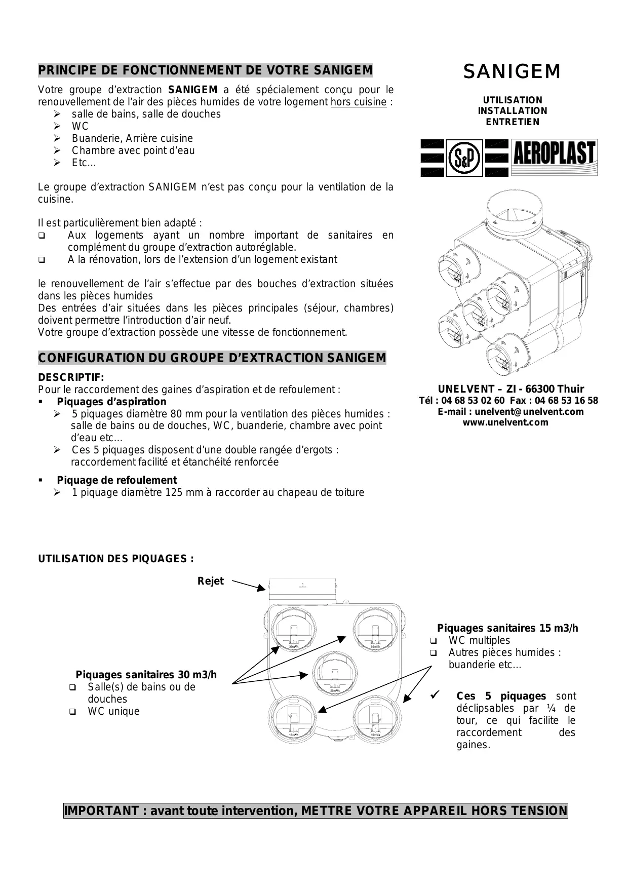 SANIGEM - VMC (Ventilation Mécanique Contrôlée) UNELVENT - Notice d'utilisation et mode d'emploi gratuit